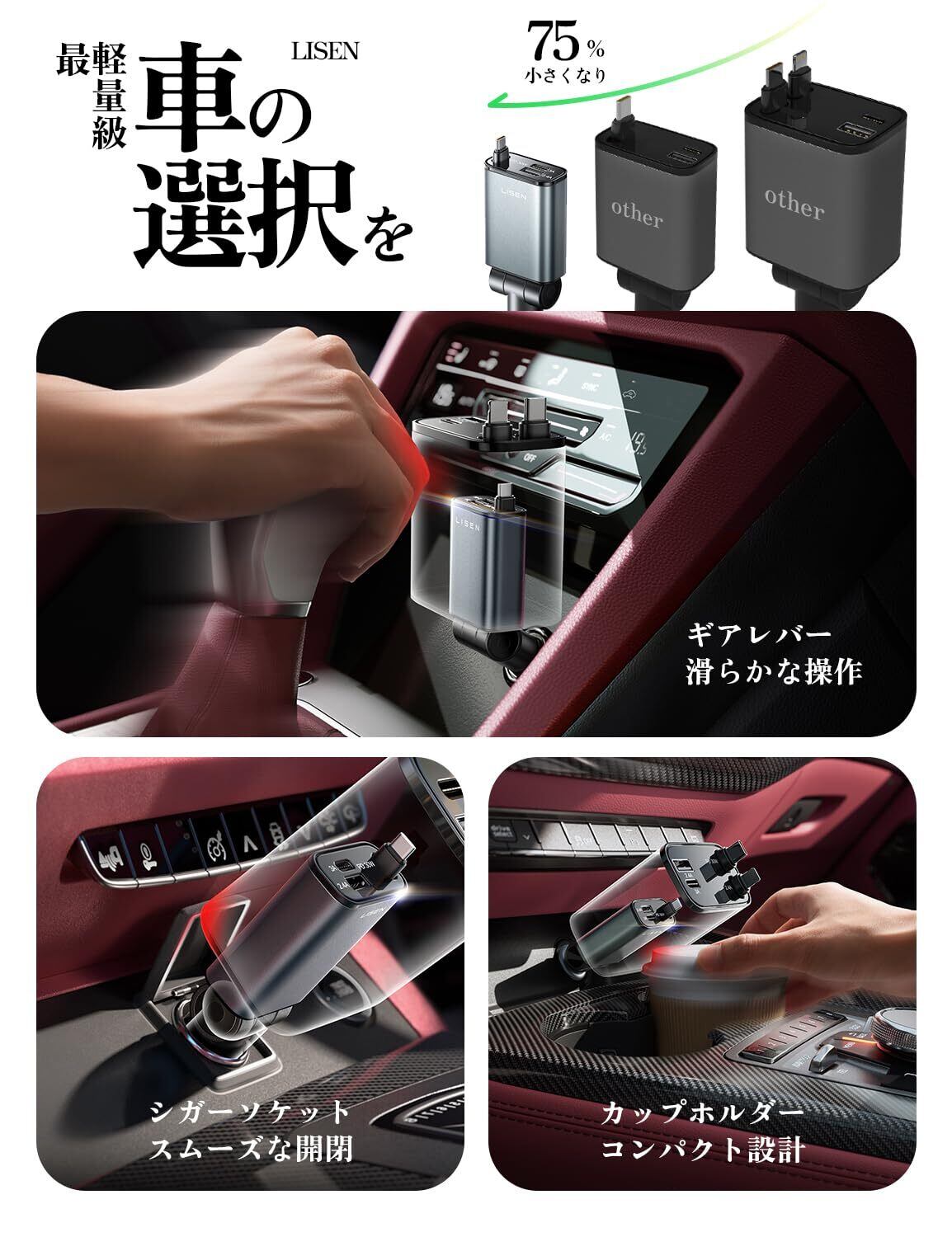 LISEN 【片づけの美学】 車 充電器 シガーソケット USB-C PD30W 巻き取り式充電ケーブル 総57W 3in1 しがーソケット usb 急速充電 車載充電器 カーチャージャー タイプc カー用品 カーオフィシャルグッズ 耐高温/短絡保護 iPhone 15 16 Pixel 9a Aquos Wish4 Sense9 スイッチ2 iPad AirPods 対応 12/24V両用