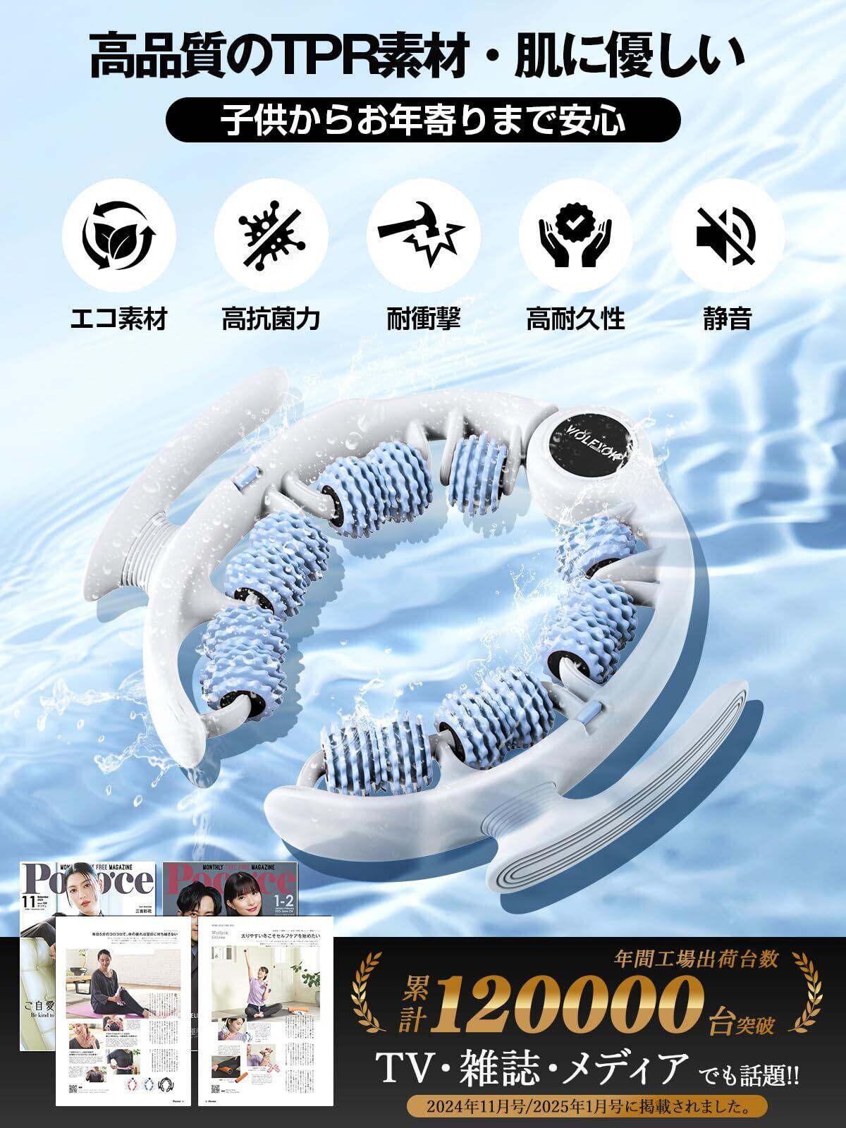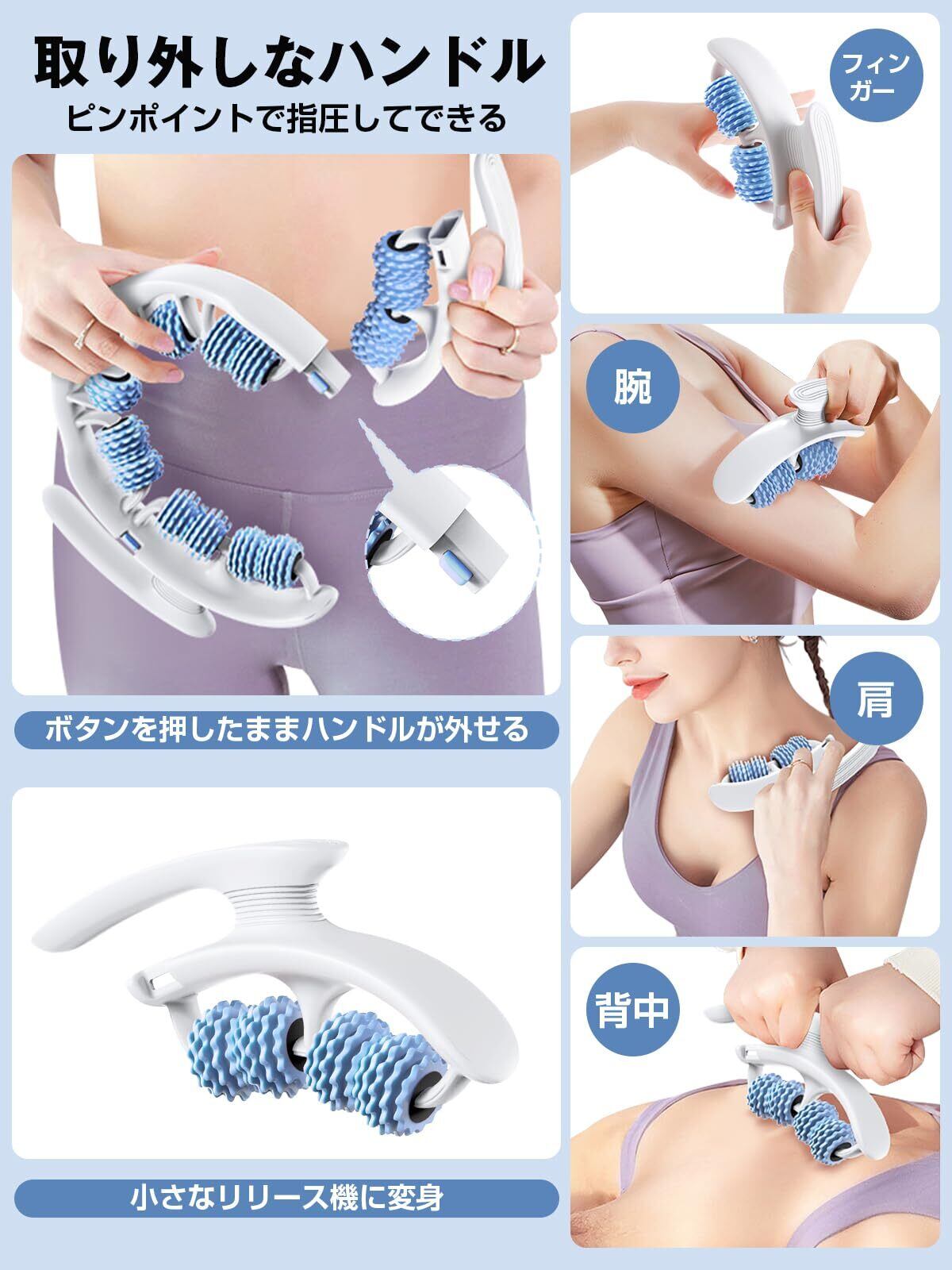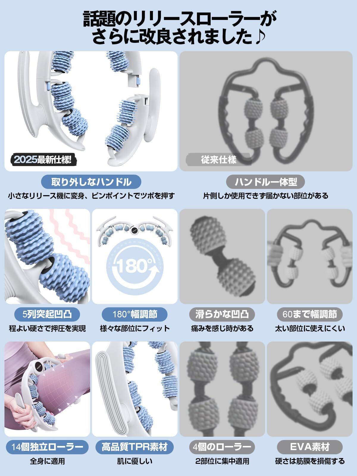 特徴 体に合わせて曲がる 取り外しなハンドル 180°まで開く 14個の独立回転ローラー 静音設計 TPR素材 人間工学設計 コンパクトサイズ