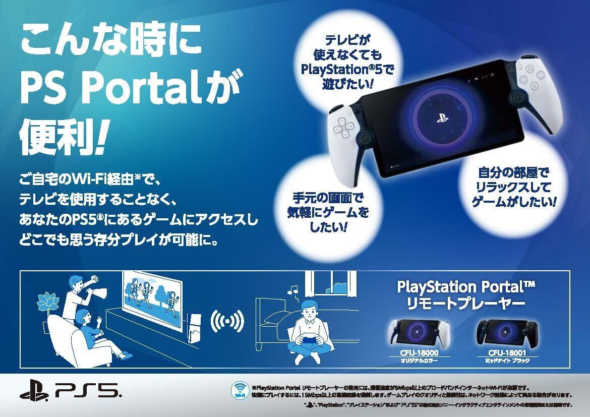 PlayStation 5のゲームをあなたの手のなかで。 PlayStation Portal リモートプレーヤーは、PS5 のゲーム体験を手元で実現するリモートプレイ専用のデバイスです。 アダプティブトリガーやハプティックフィードバックなどのDualSense ワイヤレスコントローラーの主要な機能を備え、8インチ・解像度1080p・60fpsでの描画に対応した液晶ディスプレイは、世界中のゲームクリエイターが生み出す素晴らしいゲームの数々を美麗なグラフィックでお楽しみいただけます。 PlayStation PortalがPS5 本体にWi-Fi経由で接続することで、PS5 からゲームプレイをそのまま引き継いでPlayStation Portalでお楽しみいただけます。 ※PlayStation Portal リモートプレーヤーでゲームをプレイするためにはPS5本体と、Wi-Fi接続で最低5Mbps のブロードバンドインターネット接続環境が必要です。よりよいプレイ体験のためには15Mbps 以上の高速な接続環境を推奨します。 ※ハプティックフィードバックとアダプティブトリガーは、対応しているゲームにおいてのみ使用できます。 ※ VRヘッドセット(PlayStation VRもしくはPS VR2)を必要とするゲーム、および追加の周辺機器(ワイヤレスコントローラー(DUALSHOCK 4)、DualSense ワイヤレスコントローラー、 DualSense Edge ワイヤレスコントローラーを除く)を必要とするゲームは対応しておりません。