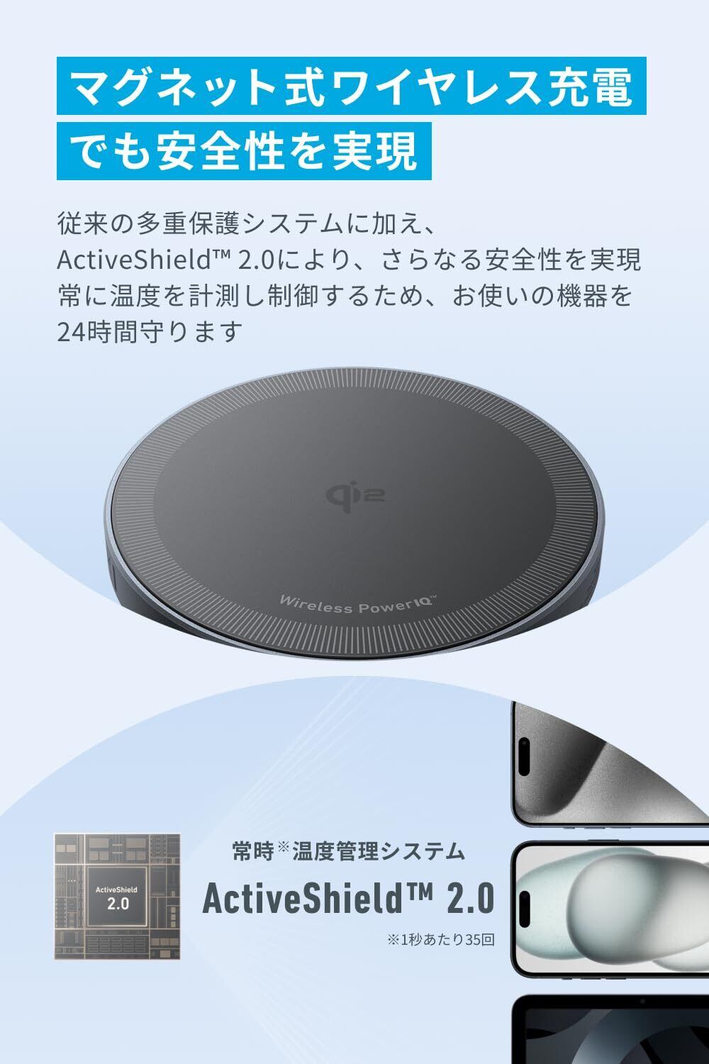 マグネット式ワイヤレス充電でも安全性を実現:従来の多重保護システムに加え、 Active Shield2.0を搭載し、さらなる安全性を実現。常に温度を計測し制御するため、お使いの機器を24時間守ります。