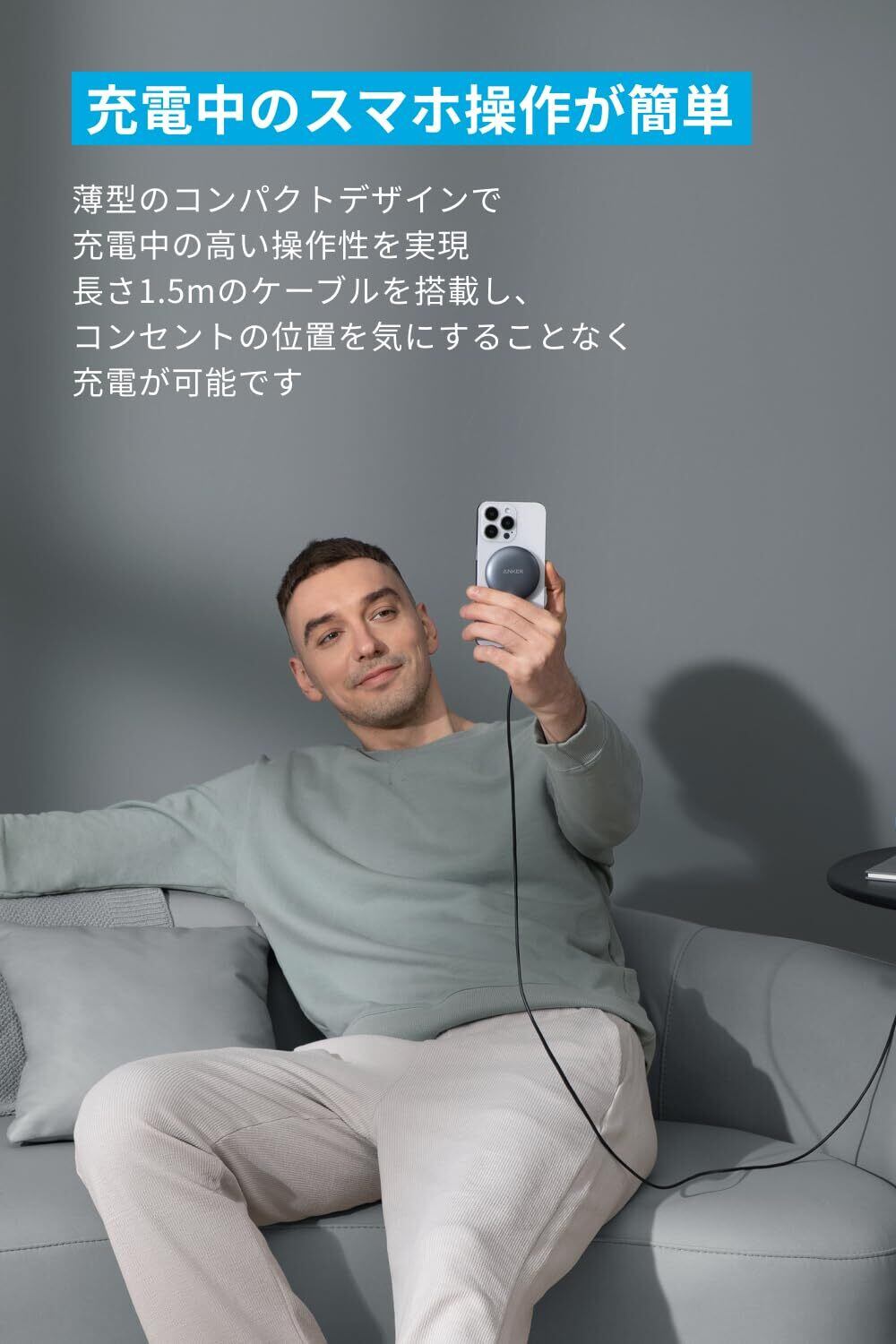 充電中のスマホ操作が簡単:薄型のコンパクトデザインで充電中の高い操作性を実現し、また長さ1.5mのケーブルを搭載。コンセントの位置を気にすることなく充電が可能です。