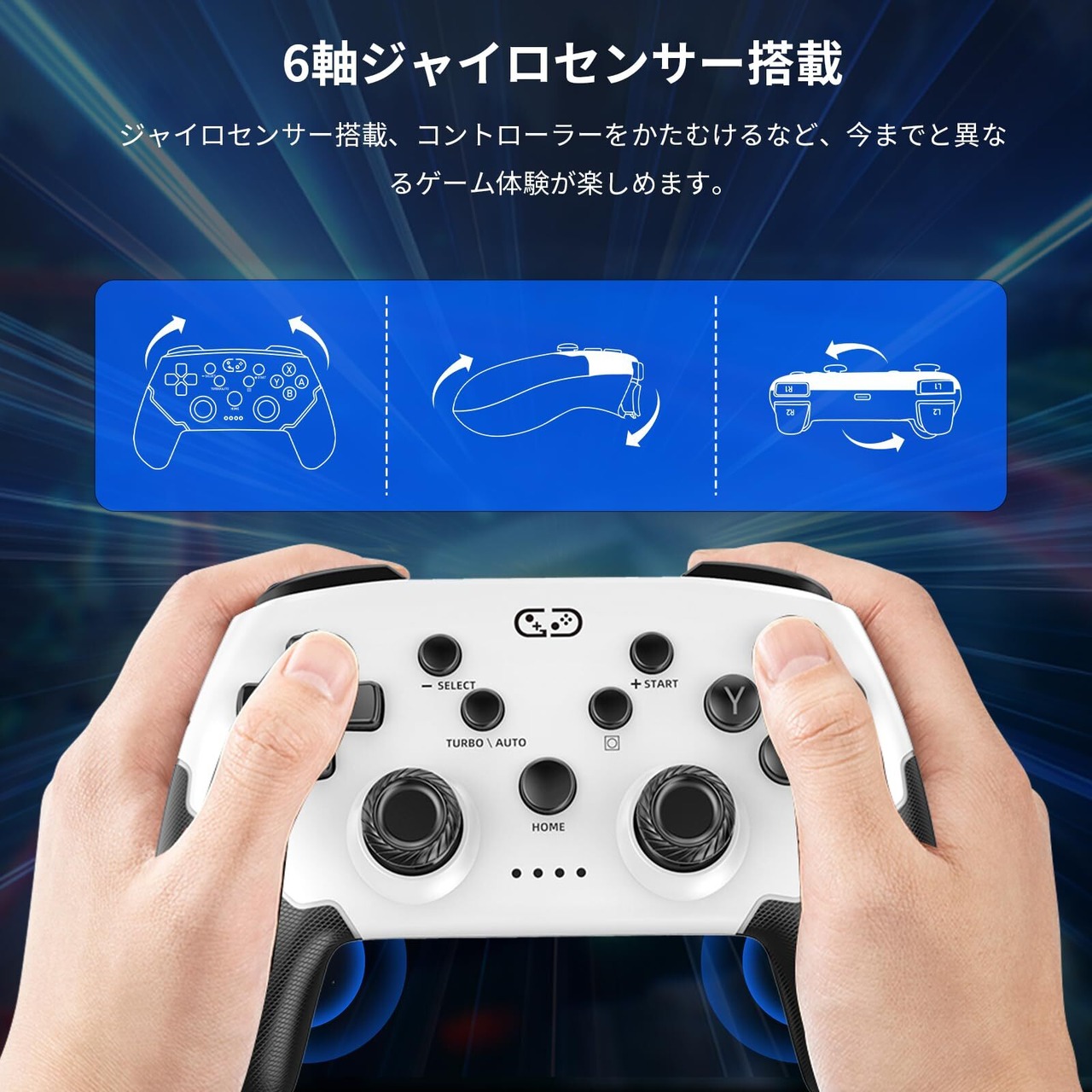 【6軸ジャイロセンサー搭載&自動連射(連射ホールド)機能】純正プロコンと同等の高感度6軸ジャイロセンサーを搭載し、コントローラーの傾きや動きを検知できます。(一部のゲームでジャイロセンサーが反応しない場合は、ゲーム内でまたは本体設定で補正することを試してください。)スクリーンショット機能付き、ワンタッチでゲームの画像を簡単に保存しております。また、本コントローラーは自動連射機能付き、TURBOボタンと設定したいボタン(A/B/X/Y/L1/L2/R1/R2ボタン)を同時に押して、手動連射になって、再度押すと、自動連射(連射ホールド)になって、三度目押すと、連射が解除されます。Turbo連射速度は3段階(毎秒5/15/20回)の微調整ができ、ゲームや自分のプレイスタイルに合わせて設置できます。※コントローラーがペアリングできない、ボタン反応しないなど、動作に異常がある場合は、背面にある小さな穴(ボタン)を針または細い棒状のもので押してから、製品を再起動してリセットします。