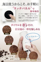 【手軽にプロの味わいを】サッと挽きたてのコーヒーを楽しめる「 電動コーヒーミル 」です。タッチパネルで簡単に操作でき、豆を入れてボタンを入れるだけでコーヒーが挽けます(1回で豆25g、約2杯分)
