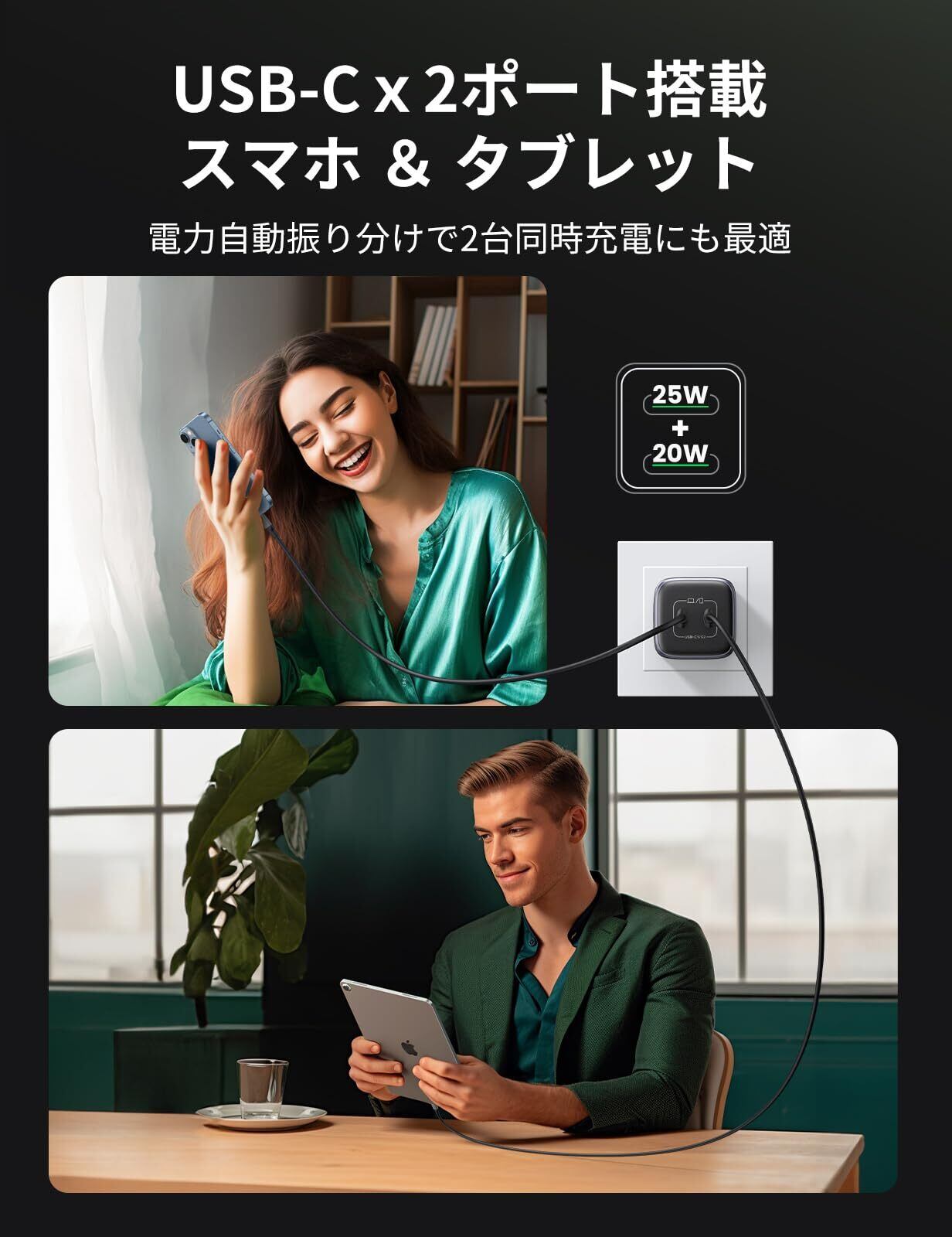 ●【1台であらゆるポータブルデバイスを充電】2つのUSB-Cポートがあり、各ポートを単独で使用すると45Wの高出力対応により、携帯から、タブレット、ノートPCまで、あらゆるポータブルデバイスの急速充電ニーズをカバーられます。また、PPS 45W 2.0バージョンの超急速充電規格にも対応し、他の充電器がPPS 25W出力でしか充電できないのに対し、Galaxy S22 Ultraでも最大速度で充電することができる45W PPS 充電器です!