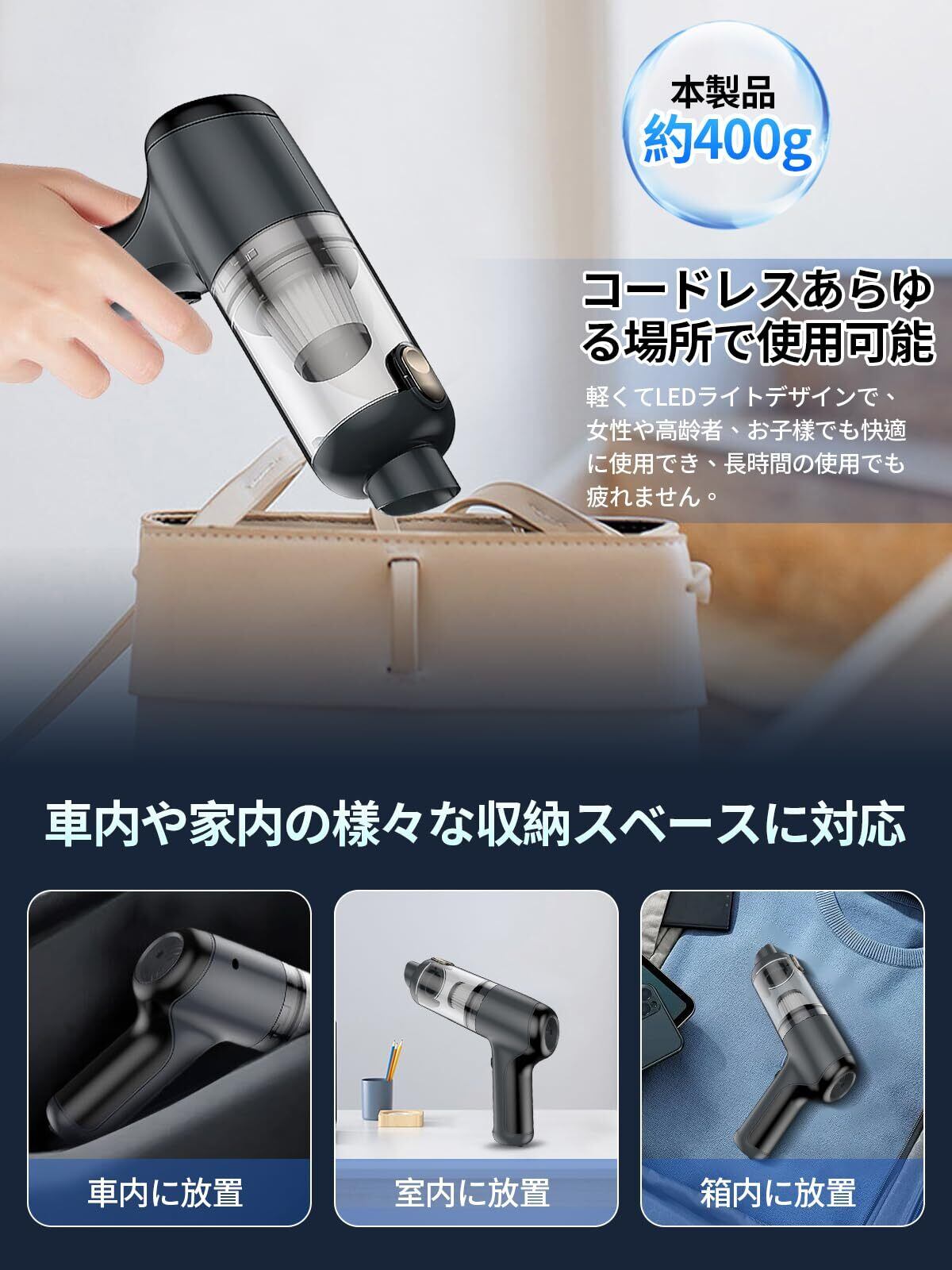【軽い・小さい・使いやすい】車載スペースを考慮した軽量コンパクト設計。わずか385gの超軽量ボディで、女性でも片手で楽々操作可能です。車内のどんな狭いスペースにも収納でき、場所を取りません。専用アタッチメント(隙間ノズル/ブラシ付きノズル/グローパイプ/ブローブラシ/ワイドノズル)が標準装備。ワンタッチで簡単に交換可能で、シート表面から窓の隙間まで、あらゆる車内の掃除に最適です。