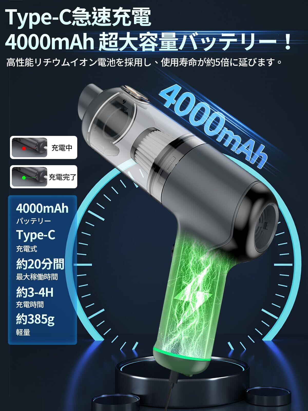 【28000Pa超強力吸引!プロ級のハンディクリーナー】業界トップクラスの性能を誇るハンディクリーナー。28,000Paという超強力吸引力で、微細なゴミまで確実にキャッチ。吸引だけでなくブロア機能も備え、一台で多様な掃除ニーズに対応します。車内のほこりや隙間の汚れもらくらく除去。大容量4,000mAhバッテリー搭載で最大20分間の連続使用が可能。軽量コンパクト設計でどこへでも持ち運び簡単。6種類の交換用ノズル付属で、あらゆる掃除シーンにフレキシブルに対応します。