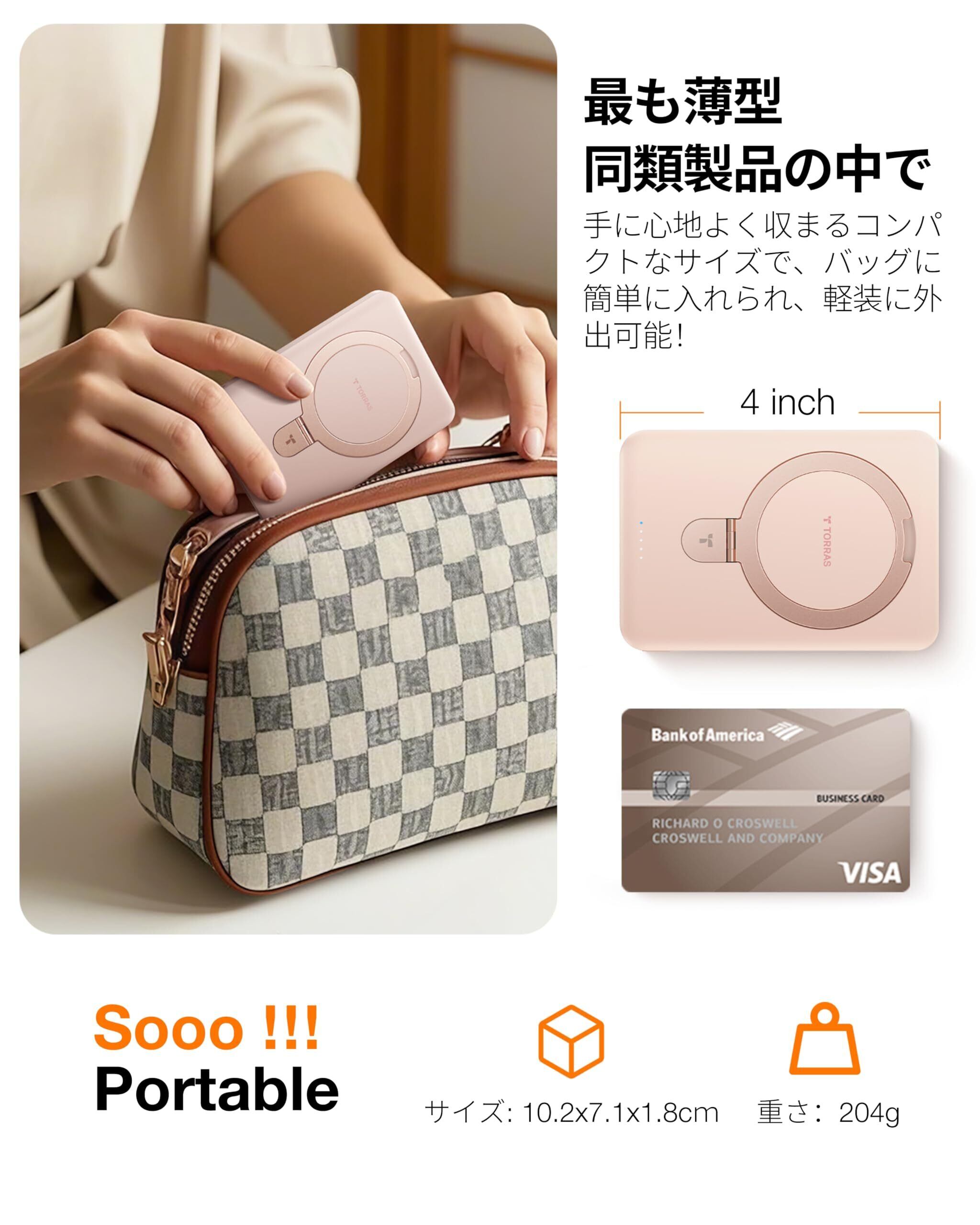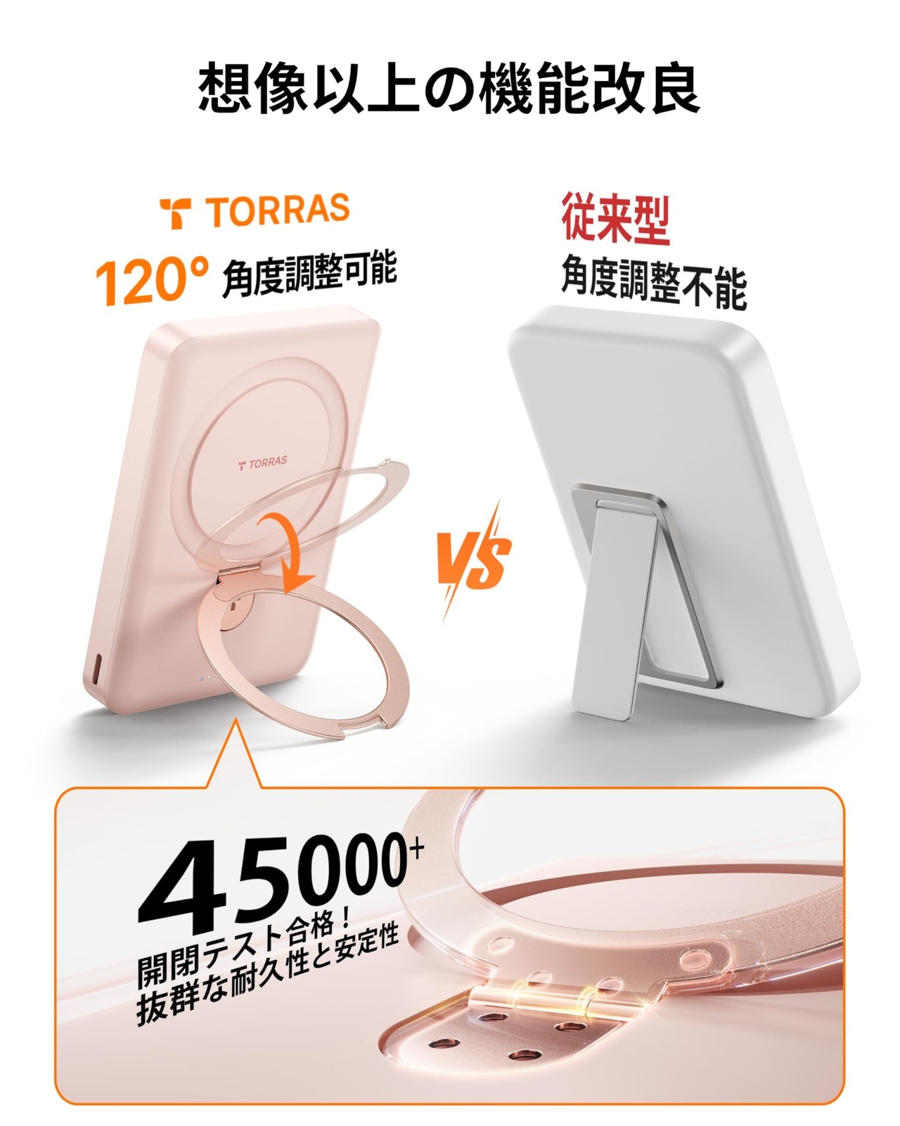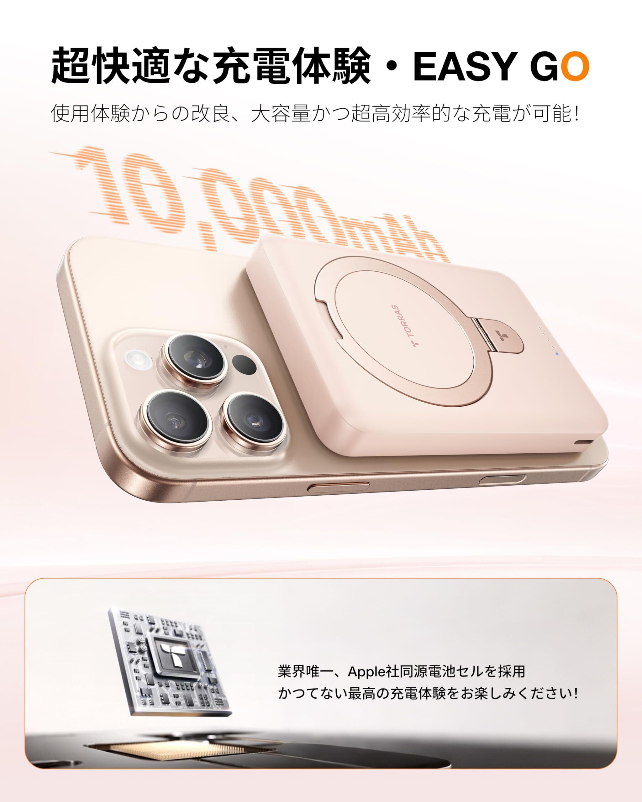 【2025傑作・EASY GO】 TORRAS モバイルバッテリー Magsafe 10000mah 軽量 小型 【Apple社同源電池セル&スタンド機能改良】 モバイル バッテリー マグセーフ 携帯充電器 最大22.5W 急速充電 Power Bank 大容量 モバ充電 マグネット ワイヤレス 充電器 パススルー機能 PSE認証済み iPhoneのみ対応 旅行 出張 ローズゴールド