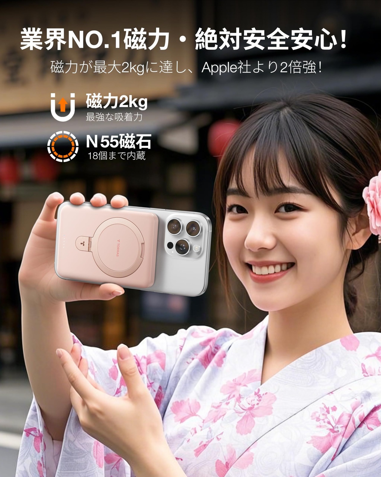 超強磁力&最大2kgに達し、Apple社より2倍強, 10000mAh超大容量&約2回フル充電, Apple社同源電池セル , 急速充電&僅か30分で50%残量回復, 超便利なスタンド機能&120°角度調整可能