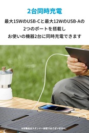 ソーラー充電:最適な環境下でご利用いただくと、最大15W出力のUSB-Cポートと最大12W出力のUSB-Aポートの2つからお使いのスマートフォンやタブレット、カメラなどを2台同時に充電できます。