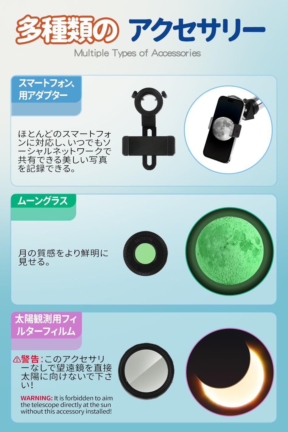 [多様な光学アクセサリーで、望遠鏡の観察がより楽しくなる] 月レンズと太陽観測用フィルターフィルムは、それぞれ月と太陽に異なる観測効果をもたらすために使用できます。さらに、スマホホルダーを使えば、いつでもどこでも美しい写真を撮影し、それをソーシャルメディアを通じて家族や友人と共有することができます。