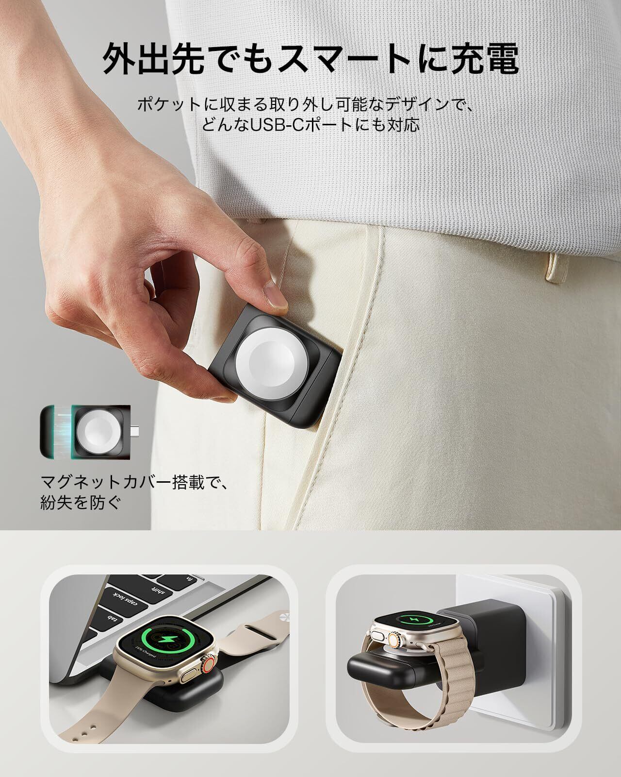 【ポータブルApple Watch充電器】: 小型で軽量なUSB-C充電器は、外出先からさまざまなデバイスを使って簡単にWatchをマグネット式ワイヤレス充電できます。