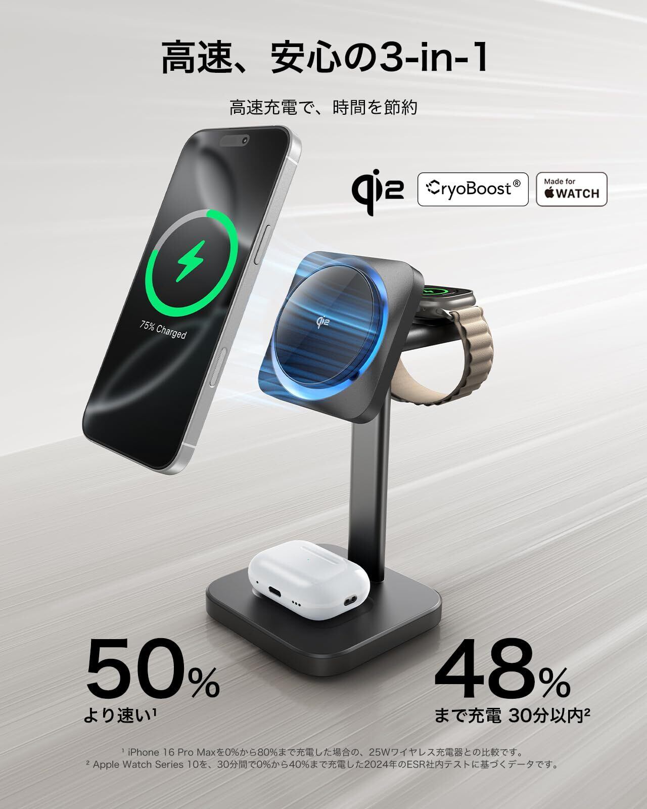 ESR Qi2 3 in 1 ワイヤレス充電器(CryoBoost搭載) Apple認定Watch充電器&15W Qi2 Magsafe充電器(iPhone用)スマホ冷却ワイヤレス充電器 iPhone 16/15/14/13シリーズ用 アップルウォッチAirPods 4/3/AirPods Pro用 ブラック
