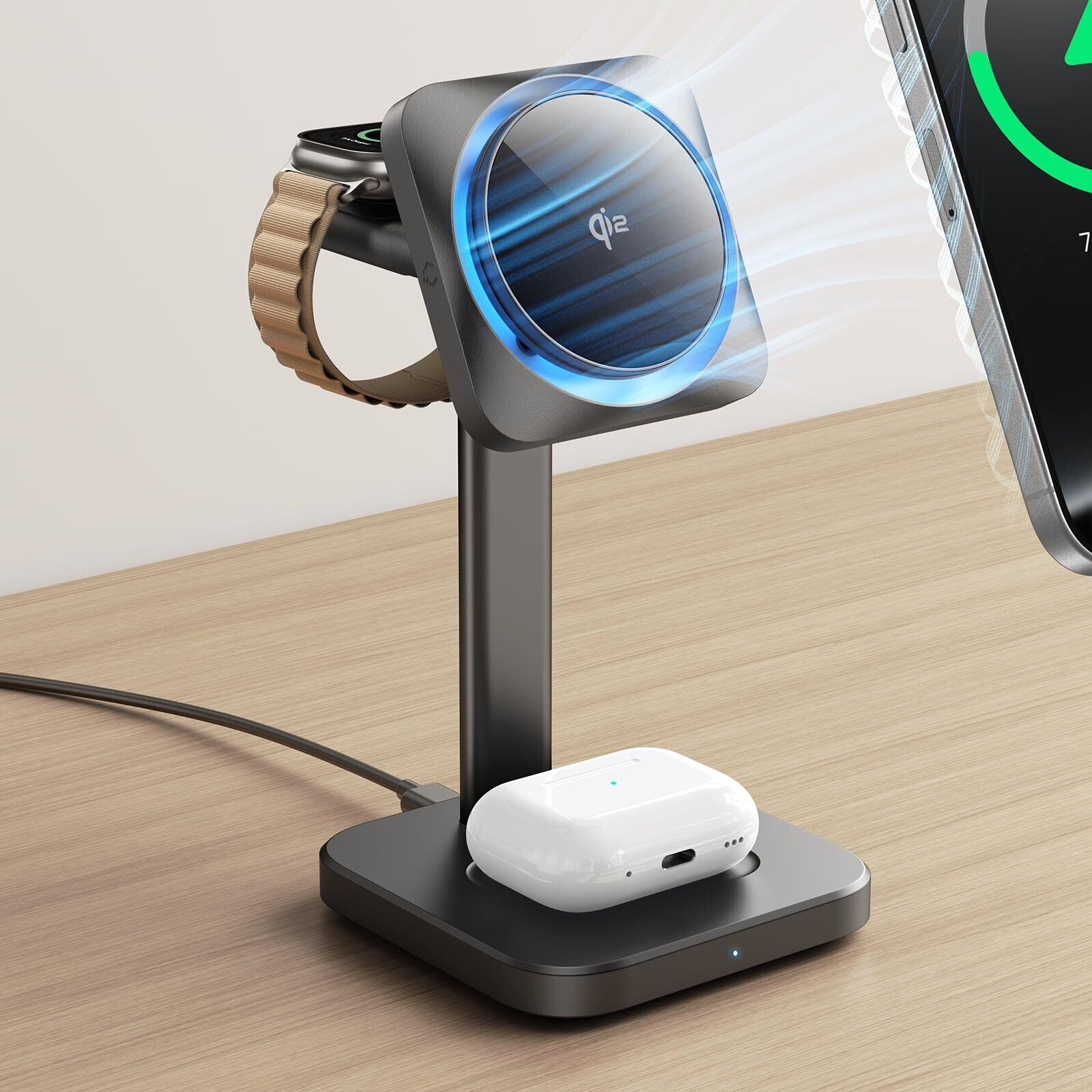 【強力なマグネットロック】:1,000gの磁力で充電中のスマホをしっかりと固定し、Watch充電器とAirPods 4パッドに内蔵されたマグネットが瞬時に位置合わせを行います。