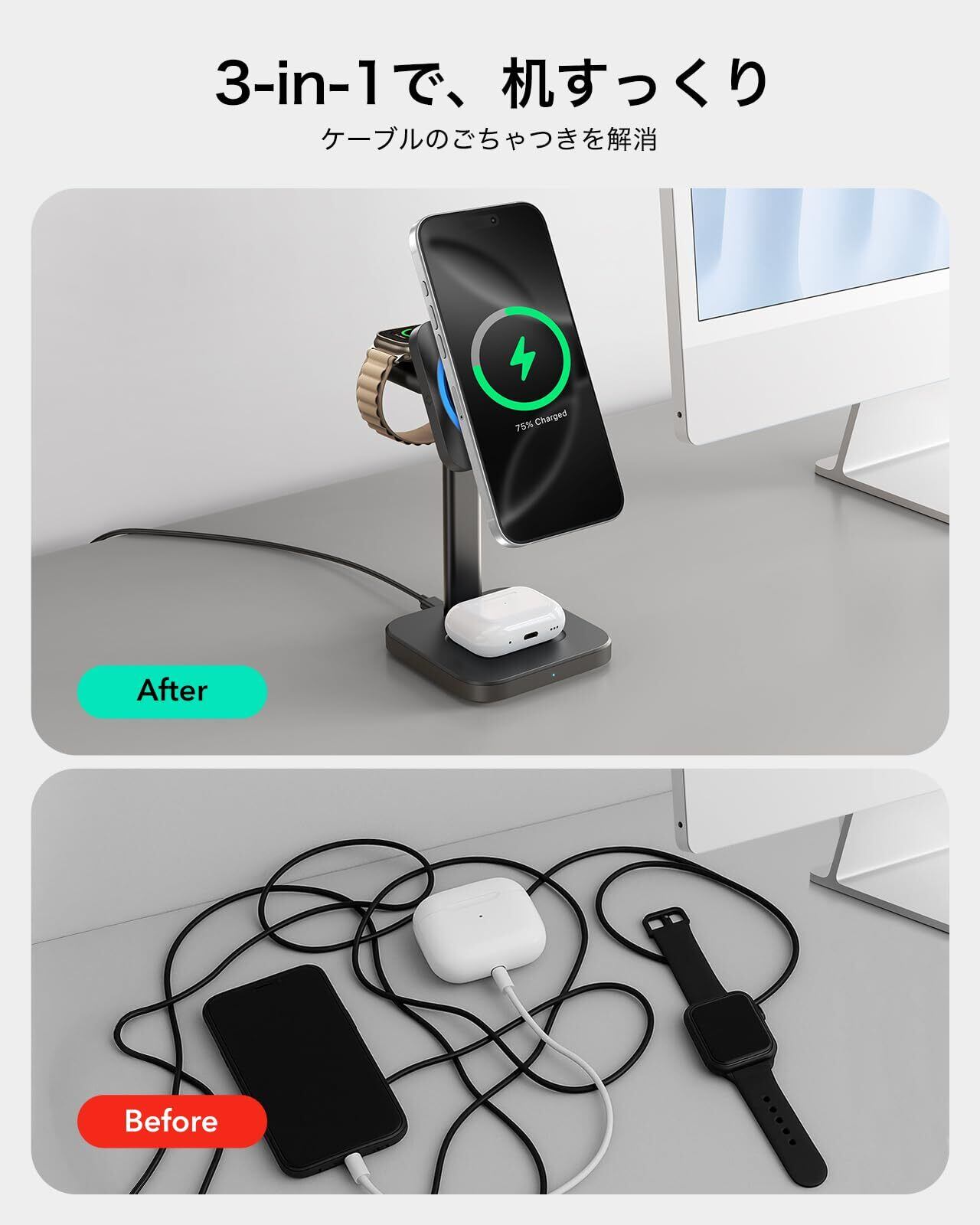 【3 in 1 MagSafe充電スタンド】: デスクやナイトテーブルをすっきりさせ、自宅やオフィス、旅行先での毎日の充電作業を簡単かつ快適にします。下記の機種にのみ、対応しています。iPhone 16/15/14/13/12シリーズ、AirPods 4 with Active Noise Cancellation、Apple Watch Ultra、Apple Watch Series 8/7/6/5/4/3/2/1、Apple Watch SE 2/1