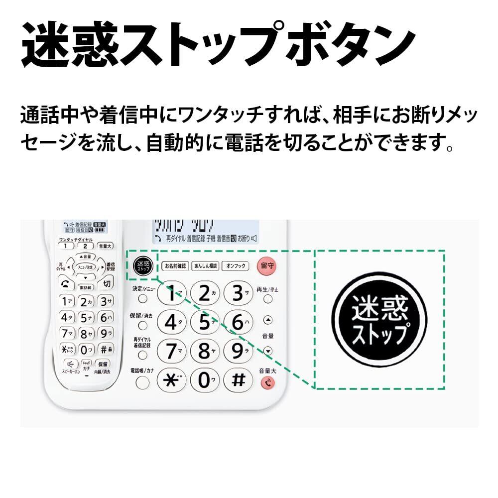 移動しながらの通話や電話の取り次ぎに便利な「親機コードレス」受話器を持ったまま移動し、好きな場所で話せます。また取り次ぎもスムーズにできます。見やすい、ホワイト液晶 親機、子機ともに、文字がくっきり見やすいホワイト液晶を採用しました。ワンタッチで撃退できる「迷惑ストップボタン」通話中や着信中にワンタッチすれば、相手にお断りメッセージを流し、自動的に電話を切ることができます。ナンバー・ディスプレイ契約時には、お断り番号リストに番号が登録され、次回からは自動で着信を拒否します。出る前に相手を確認できる「お名前確認ボタン」着信したときに押すと、相手の名前を確認するメッセージが流れるので、相手を確認してから電話に出られます。番号非通知の着信や、0120/0800から始まるフリーダイヤルからの着信は、着信音を鳴らさずお断りメッセージを流して電話を切ることができます。通話中にワンタッチで受話音量を大きくできる「音量大ボタン」相手の声が聞こえにくいときにボタンを押せば、音量を一気に大きくできます。