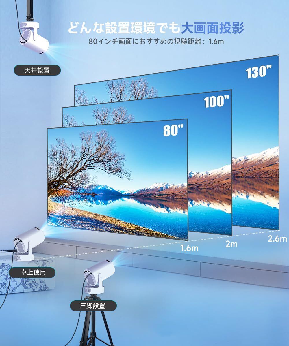 【精密調整可能なプロジェクター】自動台形補正機能(垂直±15度対応)が斜め設置時の歪みを瞬時に解消。壁や天井に投影する際も、常に長方形の整った画面を維持します。0.9:1投射比で、0.6m-2.5mの距離で40~130インチの柔軟な画面サイズ調整が可能。寝室のコンパクト投影からリビングの大画面映画鑑賞まで、空間に合わせて最適なサイズ(80インチ)を選択できます。手動フォーカス機構を採用し、ダイヤル操作で1mm単位の微調整が可能、映画の質感からテキストの細部までクリアに再現します。
