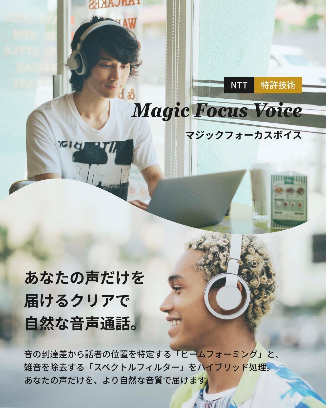 ブランド史上初、音を操るコア技術をW搭載。|通話や通信の課題解決から生まれた、音を操るコア技術をW搭載。耳をふさがないのに耳元に音を閉じ込めるNTT独自の「PSZ(パーソナライズドサウンドゾーン)」技術により、オープンイヤーなのに音漏れが気になりません。周囲の音をカットしてあなたの声だけ届けるNTTの特許技術「Magic Focus Voice」は、通話やオンライン会議での相手側の音のストレスを軽減します。