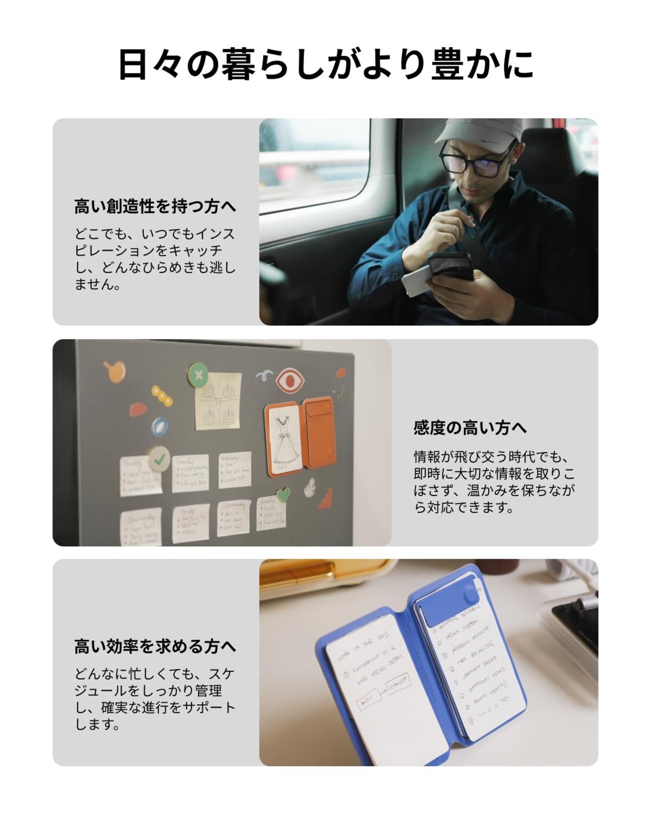 【記録・整理・収納】 記録:突然のアイデアから買い物リストまで自由にメモ可能。整理:スタンドを開くとすぐに必要な情報が確認でき、効率よくタスクを管理。収納:クリップボード裏のフォルダーで、大事なメモを保管。探しやすく、後で振り返るのも簡単です。
