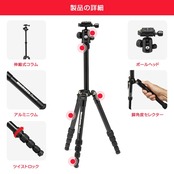 【仕様】最大耐荷重6kg / 自重1.15kg / 全伸高143cm / 伸高127.5cm / 最低高36cm / 格納高32cm / カラー:ブラック / 素材:アルミニウム製 / 脚段数 5 / 雲台タイプ:ボール雲台 / 最上部アタッチメント:1/4″ ネジ 【保証】 正規代理店で購入頂いた商品に関しては、購入から1年間の品質保証があります。