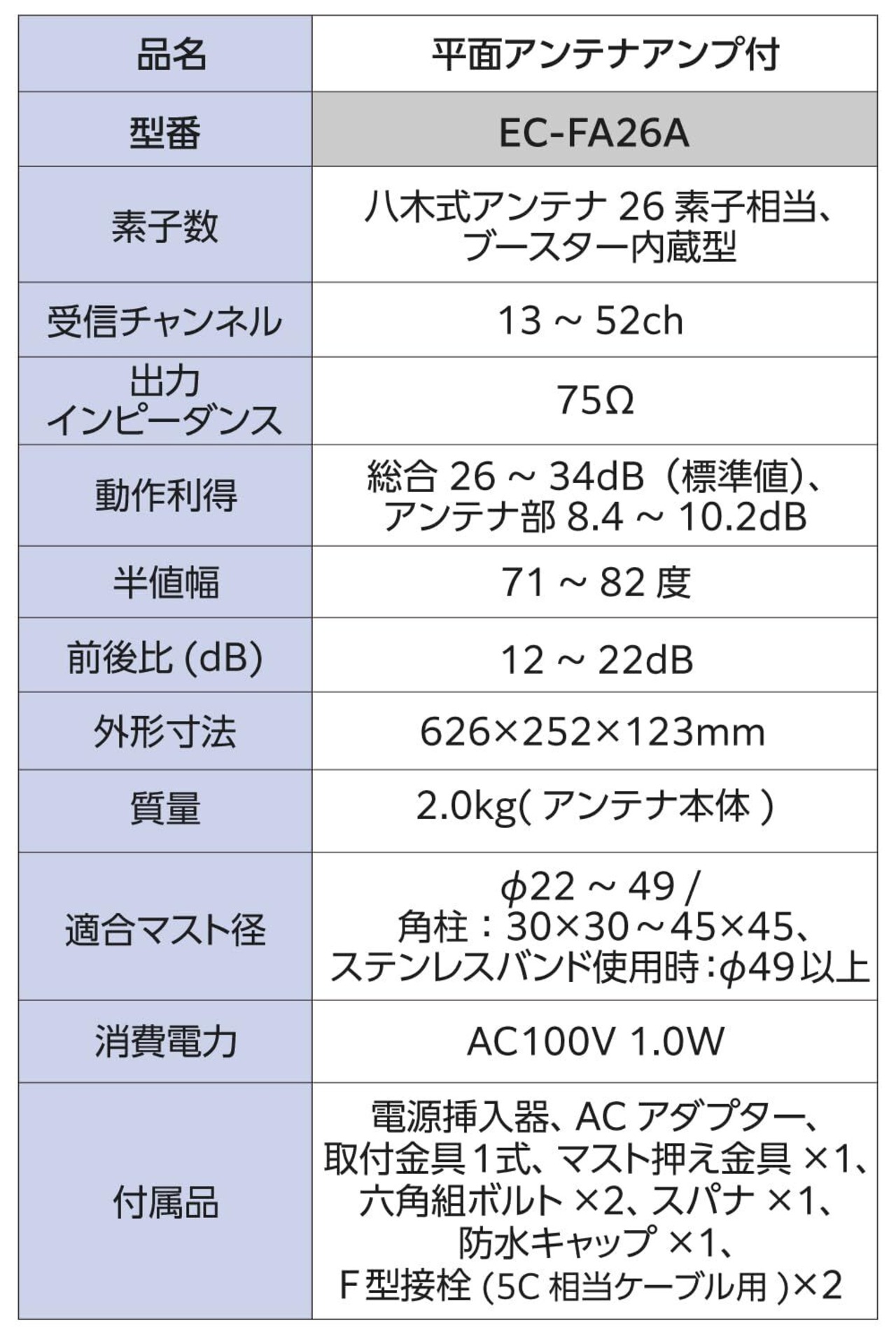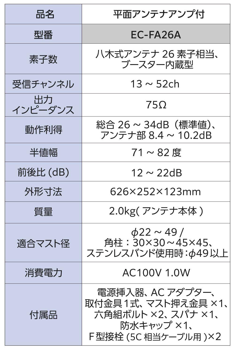 DXアンテナ アンテナ 地上デジタルアンテナ (ブースター内蔵) UHF 壁面(26素子相当) オールチャンネル(13ch.~52ch.)対応 小型 簡単に組み立て 中・弱電界地域向け EC-FA26A