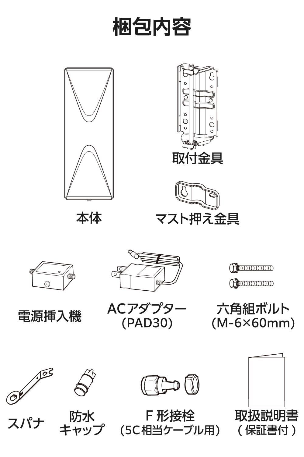 付属品 電源挿入器(PI20)×1、ACアダプター(PAD30)(コード長約1.8m)×1、取付金具×1、マスト押え金具×1、六角組ボルト(M6×60mm)×2、スパナ×1、防水キャップ×1、F-5接栓×1