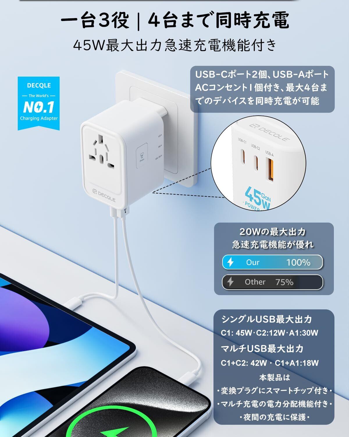 【新春セール】【GaN 45W 急速充電】 decqle 海外 変換プラグ コンセントマルチ変換プラグ 2 USB-C(GaN45W 急速充電)& 1 USB-Aポート 4台同時充電 全世界対応(アメリカ/イギリス/ヨーロッパ/オーストラリア/中国などの224+国々に対応)旅行用 タブレットに対応 白い | ニコニコSHOP