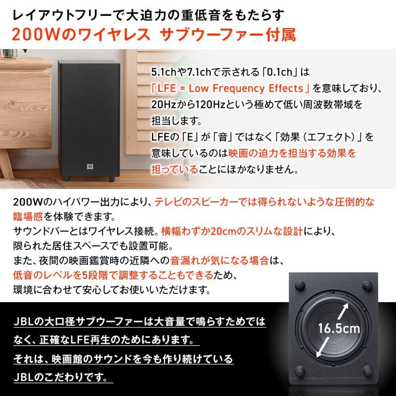 限られた居住スペースでも重低音専用の横幅わずか20cmのスリムなサブウーファーで、映画作品に収められた音をテレビのスピーカーでは得られないような圧倒的な臨場感を体感できる。サウンドバーとの接続はワイヤレス接続のため、サウンドバーとの距離を気にせずに設置が可能。
