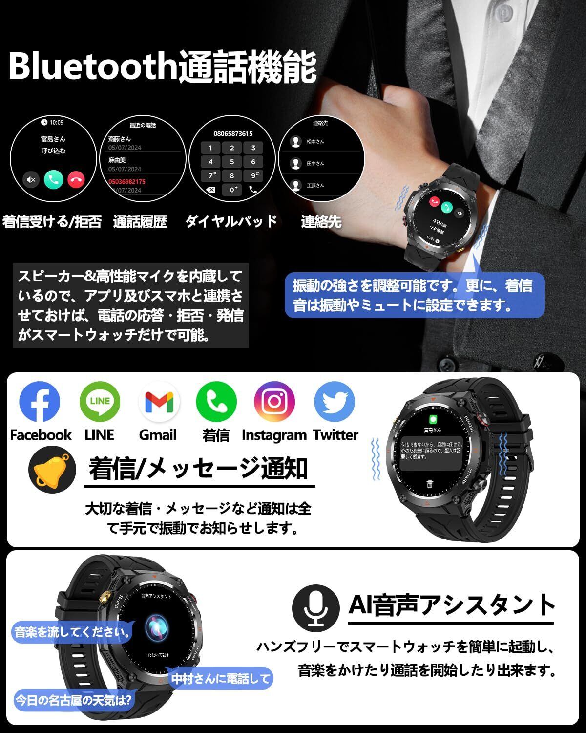 【Bluetooth5.3通話機能とメッセージ通知一体】 業界最先端のBluetooth 5.3を採用し、従来のスマートウォッチの通信問題を大幅に改善し、電池寿命、通信速度、通信範囲、接続の安定性も大幅に向上し、省エネ性も強化された。iPhoneおよび(Android)アンドロイドに対応しているスマートウォッチはスピーカー&高性能マイクを内蔵し、スマホを取り出さず装着したまま音声通話ができます。電話に出たり通話したり、連絡帳・履歴から電話をかけたりできます。運転、家事、運動中で両手を解放し、生活と仕事の素晴らしいアシスタントです。また、スマホとペアリングすると、Line、SMS、Twitter、Facebook、Instagramなどのソフト情報はバイブレーションで快速的に通知されます。一切の大事な連絡を絶対に見逃しません。運動中や会議中はわざわざスマホを取り出す必要がありません。さらにスマートウォッチ本体でバイブの強さを「弱・強」の中から選ぶことができ、着信音の出るやミュートも設定することができます。
