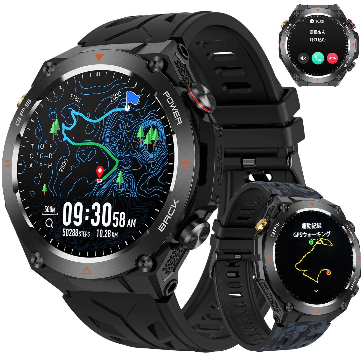 スマートウォッチ【2025年新設計 時計にGPS内蔵 軍用規格 迷彩柄バンド付き】スポーツウォッチ 耐衝撃 コンパス搭載 Bluetooth5.3通話 1.45インチ大画面 腕時計 15日間ロングバッテリー 100+運動モード 文字盤DIY 振動と着信音設定 高度計 気圧計 腕時計 1ATM防水 Lineなど通知 天気 ゲーム 音声アシスタント 歩数計 iPhone アンドロイド対応 日本語説明書
