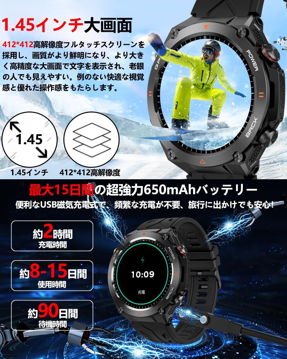 【2025業界革新モデルGPS内蔵スマートウォッチ・4衛星測位システム&軍用規格&1.45インチ大画面】このGPS内蔵スマートウォッチは4衛星測位システム(GPS、GLONASS、GALILEO、BDS)に対応しております。GPS内蔵ですので、スマホを持たず運動軌跡を記録できます。最高の安定性&正確性を実現しました。ビルが立ち並ぶ都市部のランニングやサイクリングなどでも、環境やマルチパスの干渉を受けにくい測位をお楽しみください。スマートウォッチは特殊な複合材料を採用され、耐低温、耐高温、耐衝撃、防水防塵など、多くの軍用標準テストに合格することができます。スポーツウォッチは、間違いなく野外活動のようなときにあなたの信頼できる仲間になることができます。Smart watchの画面は耐衝撃性のガラスが採用するため、耐久性と傷がつきにくくなっています。日常から過酷な自然環境まで、あらゆるシーンで適用されます。1.45インチのカラースクリーンを搭載され、412×412ピクセル高解像度で、太陽光の40%を反射する性質があり、大きなフォントで屋外でも老眼の方でも情報やデータが見やすく表示されます。