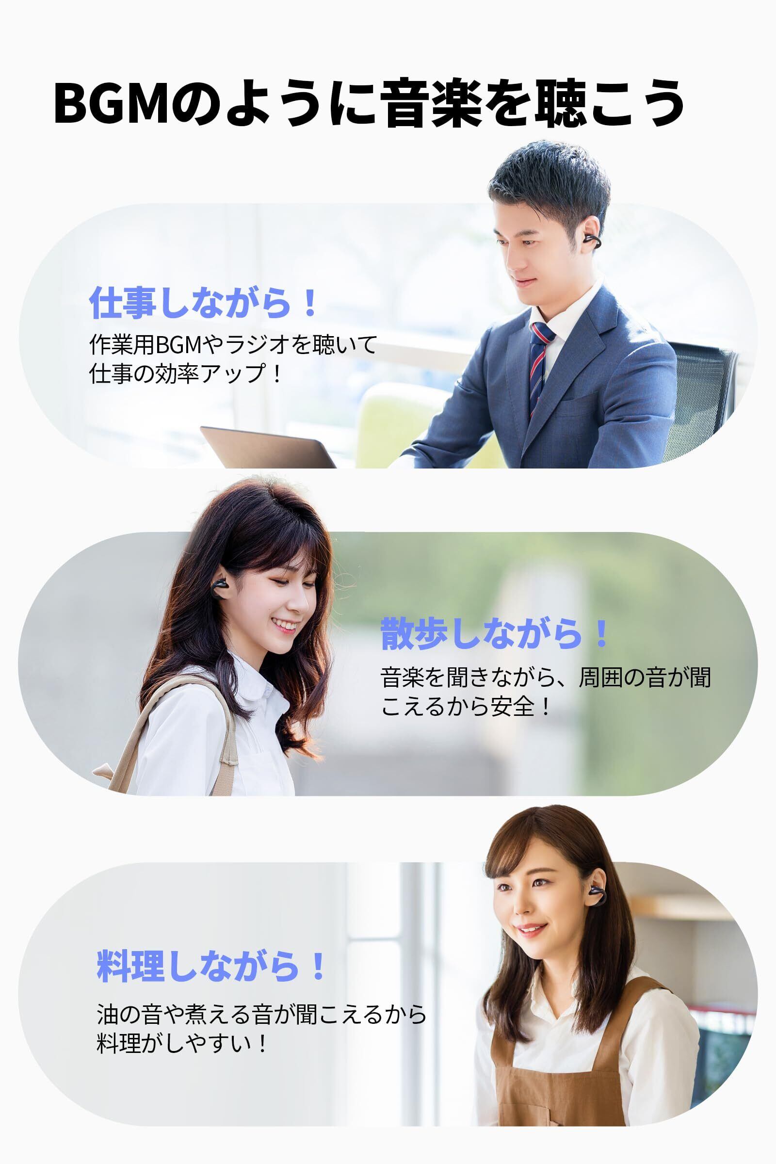 【耳に挟むだけで聞こえる、「ながら聴き」体験の再定義!】イヤーカフ型のイヤホンだから、アクセサリー感覚で耳の軟骨を挟むだけで、耳の穴を塞がずに音楽を楽しめます。外部の音を完全に遮断しないため、車のクラクションやアナウンスなどの環境音も自然に聞き取れるので、安心してお使いいただけます。音楽を聴きつつ家事をしているときでも、家族と自然なコミュニケーションをとることができます。カナル型イヤホンの蒸れ・痛み・かゆみ、骨伝導型や耳掛け型で起こりがちな耳への負担、サングラスやメガネ、マスクとの干渉といった問題は発生しません。日常生活の様々なシーンで、音楽を聴きながら快適な長時間使用が可能です。