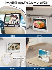 【4方式使用設置】卓上スタンド置き・壁に・吊り下げ・車載。室内やアウトドアなど幅広いシーンで使用できます。車載用バッグを付属しており、運転席や助手席のヘッドレストにしっかりと取り付けが可能。外付けハードディスクやSDカードに録画した内容を視聴することも可能です。アニメなどでドライブの時にお子さんが退屈しないよう使用することもできます。後部座席でテレビを楽しみたい方におすすめです。また、車中泊やキャンプなどにもおすすめのアイテムです。キッチンに置いて料理をしながらテレビを観るのに使用。※スタンド角度調整可卓上テレビ。裏面にネジ穴があります。VESA100*100に対応可。