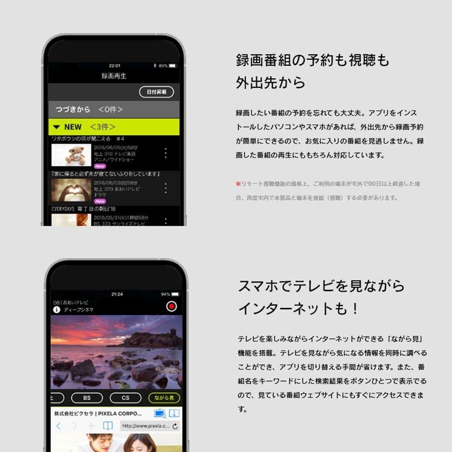 【業界初のクラウド録画】HDD録画に加えてクラウドにも録画できるようになりました。クラウド上の録画データはクラッシュの心配がありません。録画にHDDを使わない場合はXitAirBox の本体周りがスッキリします。【家でも外出先でもテレビが見られる】出張や旅行先でいつものテレビを見たくなったことありませんか? 他府県に移動するだけで放送される番組が違いますよね。ワイヤレステレビチューナーは家のルーターとアンテナ線につなぐだけでインターネットができるいろんな場所でフルセグ放送が楽しめます。リアルタイムで野球中継やニュースなどお楽しみください。【クラウド録画の動画サイズ】画質:高 平均ビットレート:6Mbps ビデオ解像度(BS/CS):1920×1080 1時間の目安:27GB画質:標準 平均ビットレート:4Mbps ビデオ解像度(BS/CS):1920×1080 1時間の目安:18GB画質:低 平均ビットレート:2Mbps ビデオ解像度(BS/CS):1280×720 1時間の目安:9GB※地上デジタルの高画質及び標準過失の解像度は1440×1080です。【チューナー】地デジ/BS/CS110度x 2(CATVパススルー対応) 【インターフェース】アンテナ入力x 1 (F型コネクタ) LAN x 1 (10BASE-T/100BASE-TX) 電源x 1 (DC入力) USB x 1 (Type A) 【対応ハードディスク容量】8TB(最大)【対応OS】Windows10(Home /Pro)MacOS/iOS/Android【動作環境】温度: 0 ~ 40 ℃湿度: 5 ~ 90%RH(結露なきこと)