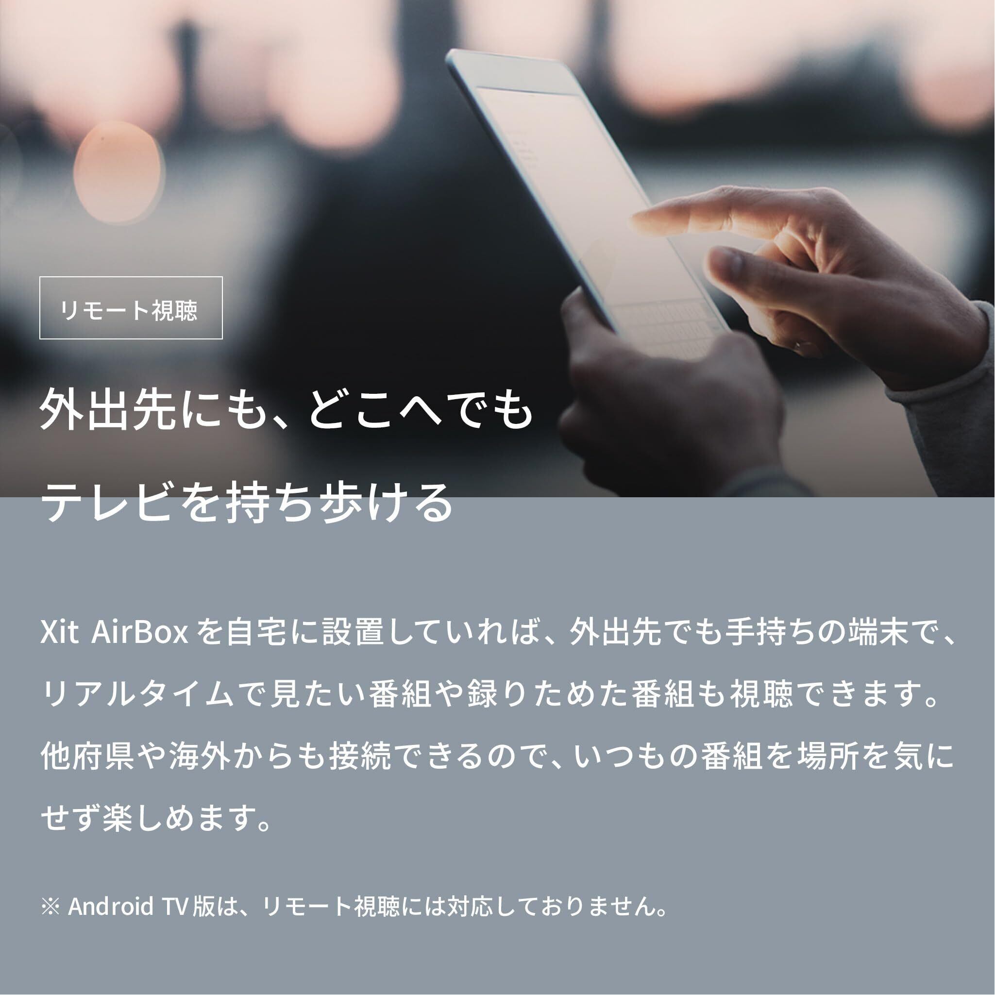 Xit AirBox を自宅に設置していれば、外出先でも手持ちの端末で、リアルタイムで見たい番組や録りためた番組も視聴できます。