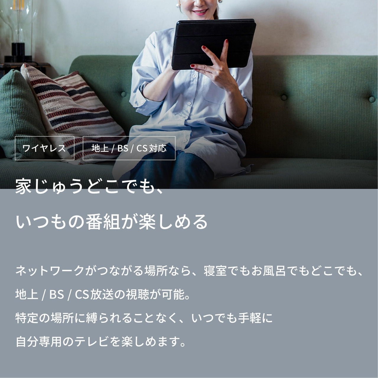 家中どこでも、外出先でも、ワイヤレスでテレビが楽しめる。地上 / BS / CS放送の視聴が可能。