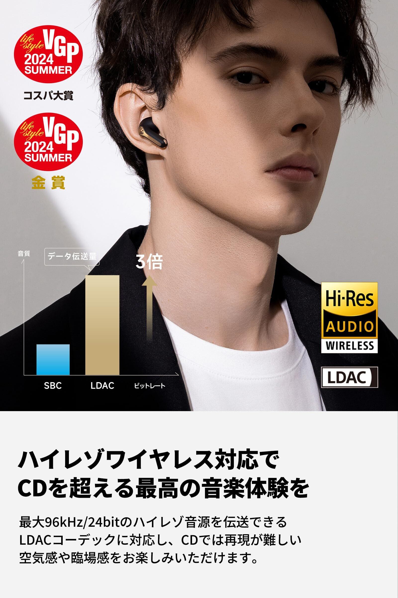 【ハイレゾワイヤレス対応、微妙な音のニュアンスも逃さない!】ハイレゾワイヤレス認証を取得し、20Hz~40kHz(従来のコーデックは20Hz~20kHz)という広い再生帯域をカバーすることで、ボーカルや楽器の音を繊細に描き出します。ハイレゾ相当の高音質を誇る「LDAC」に対応し、標準のBluetoothオーディオコーデックSBCと比べて最大約3倍の情報量を伝送します。原音を忠実にトレースし、ハイレゾ音源の繊細なニュアンスを描き出します。※マルチポイント接続時にLDACは使用できません。