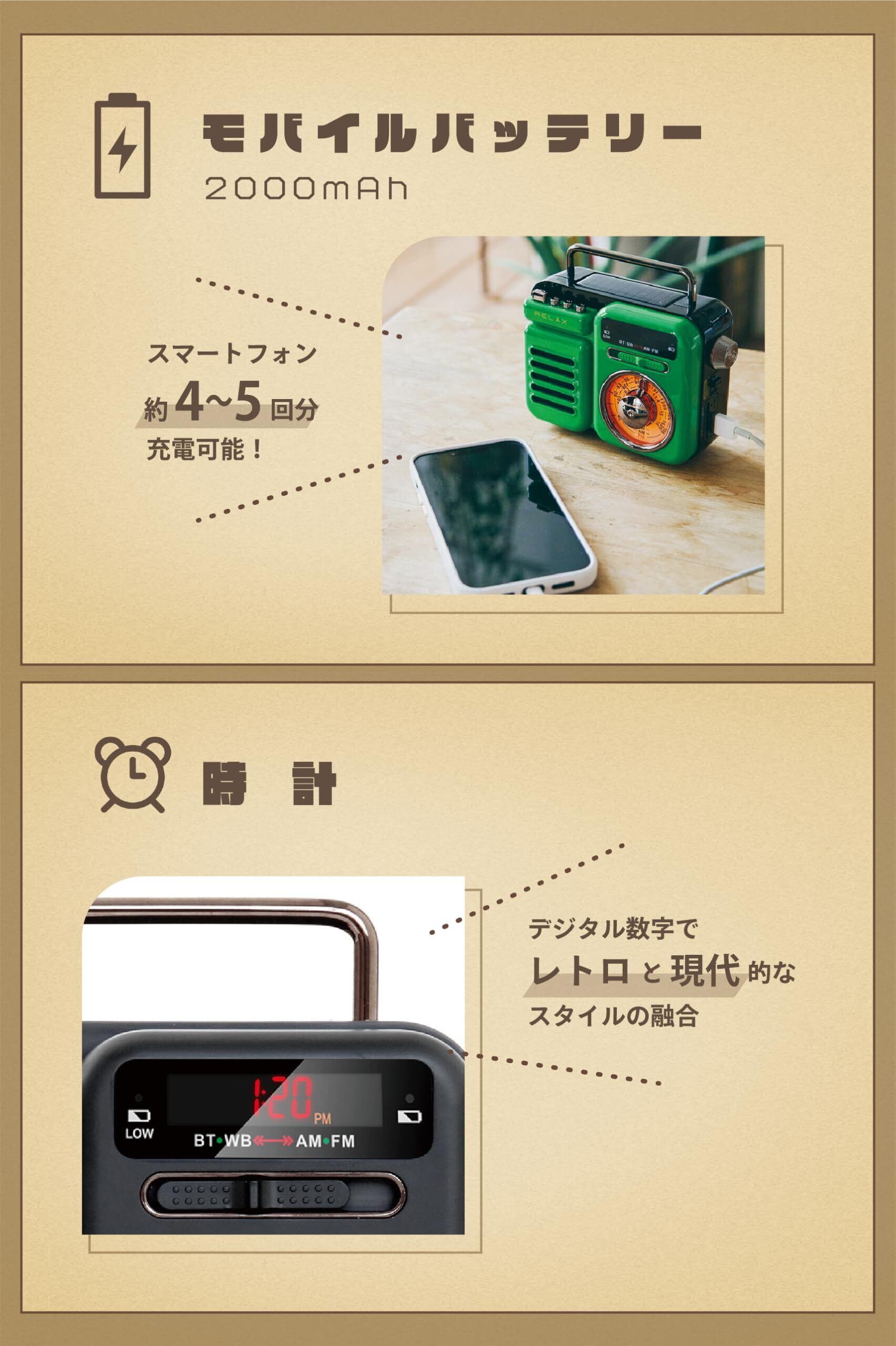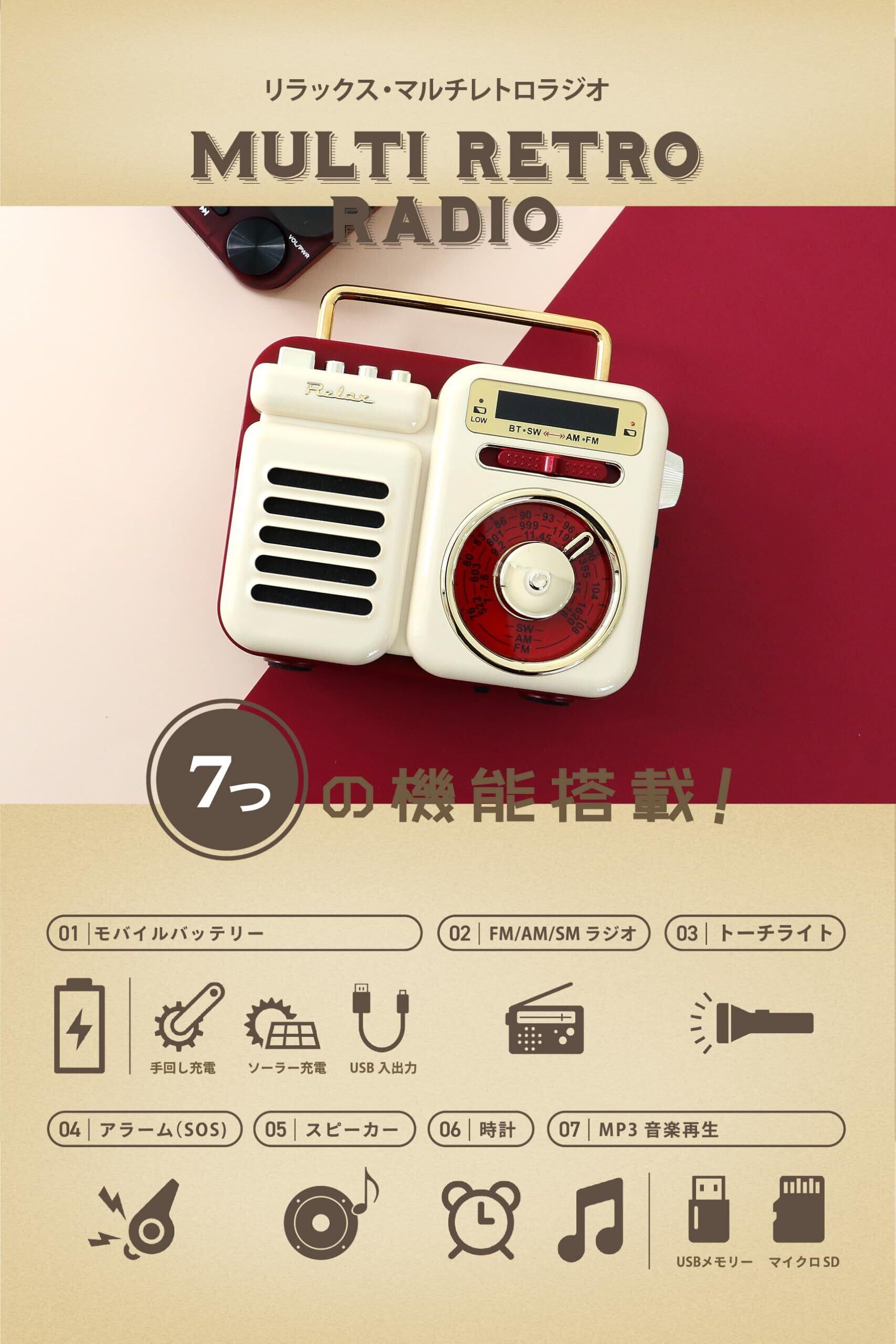 【AM/FM/SWラジオ】いつでもどこでも、お好みのラジオ番組を楽しめるAM/FM/SWラジオチューナーを搭載。AM放送はニュースやトーク番組、FM放送は音楽番組や情報番組、そしてSW(短波)放送は海外放送やアマチュア無線など、多彩なジャンルの放送を受信できます。特に災害時には、正確な情報を入手するための重要なツールとなります。電池がなくても、手回し発電で一時的に使用できるため、非常時にも安心です。※持ち手部分はアンテナではありません。アンテナはラジオ内部に搭載されています。※ラジオのアンテナ感度はご使用の場所や他社のラジオと比較して相違があります。繋がらない場合は場所を移動してご利用ください。 【Bluetooth&MP3音楽再生のスピーカー搭載】Bluetooth接続機能を搭載しており、スマートフォンやタブレットなどのBluetooth対応機器とワイヤレスで接続し、お気に入りの音楽を再生できます。面倒なケーブル接続は不要で、手軽に音楽を楽しめます。また、MP3ファイルを保存したUSBメモリやmicroSDカードを挿入すれば、単体で音楽プレーヤーとしても使用可能です。内蔵の高音質スピーカーは、コンパクトながらも迫力のあるサウンドを実現。お部屋でのリラックスタイムや、アウトドアでのBGMとして、豊かな音楽体験を提供します。 【手回しとソーラー発電】内蔵バッテリーは、手回しハンドルを回すことで充電できる手回し発電機能と、本体上部に搭載されたソーラーパネルに太陽光を当てることで充電できるソーラー発電機能を備えています。これにより、コンセントがない場所や、停電時など、電源を確保できない状況でもラジオやライト、モバイルバッテリー機能を使用できます。手回し発電は、緊急時に必要な電力を確保するための重要な機能であり、ソーラー発電は、晴れた日中に継続的に電力を供給するための便利な機能です。※手回し発電とソーラー発電はかなりの時間を要すため、通常時はUSB充電でご使用いただくことを推奨いたします。 【モバイルバッテリー】本体に搭載されたUSB-Aポートから、iPhoneやスマートフォンなどのデバイスを充電できるモバイルバッテリー機能を搭載しています。外出先でスマートフォンのバッテリーが切れてしまった場合や、災害時に電源を確保できない状況でも、このラジオがあれば安心です。手回し発電やソーラー発電で蓄えた電力を利用できるため、非常用電源としても役立ちます。※容量は2000mAhと決して大容量ではありません。 【トーチライト】夜間や暗い場所での移動、作業、または緊急時に役立つトーチライトを搭載しています。広範囲を明るく照らすことができます。懐中電灯としてだけでなく、非常時の照明としても活用できます。手回し発電やソーラー発電で点灯できるため、電池切れの心配もありません。 【アラーム(SOS)】緊急時に周囲に助けを求めるためのSOSアラーム機能を搭載しています。ボタン一つで、大音量のアラーム音と高輝度フラッシュライトを同時に作動させることができます。これにより、周囲に自分の存在を知らせ、救助を求めることができます。災害時や遭難時など、緊急事態に備えておくと安心です。 【時計】時刻表示機能を搭載しており、いつでも正確な時間を確認できます。デジタル表示で見やすく、アラーム機能と合わせて、日常生活でも便利に使用できます。 【TELEC認証取得済】TELECとは日本を代表する無線設備の認証・試験機関です。 「RELAX マルチレトロラジオ」は、技術基準適合照明を取得しています。 【日本企業だからこその安心のサポート体制】RELAX マルチレトロラジオでは、お客様に安心して製品をご利用いただけるよう、1年間の保証期間を設けております。万が一、初期不良や通常使用における製品の不具合が発生した場合は、迅速に修理や交換などの対応をさせていただきます。 お問い合わせの際は、Amazonのご注文番号をお知らせいただけますと、スムーズな対応が可能です。 【SPEC】■サイズ:128×57×98mm、■重量:395g、■充電方法:USB充電、手回し充電、ソーラー充電 ■周波数帯域:SW:7-16 MHZ/FM:76-108 MHZ/AM:522-1620MHZ ■バッテリー:2000mAh/3.7 ■リチウムイオンスピーカー:8W 4Ω ■Bluetooth:BLUETOOTH5.0 ■LEDライト:120LM ■作動電圧:2.7V~4.2V ■充電時間(USB):約3~4時間 ■完全充電後 動作時間目安:BLUETOOTH フルボリューム 約3.5時間、75%ボリューム 約5時間、LEDライト:約6時間、ラジオ:中音量再生時 約20時間 ■付属品:取扱説明書・保証書、マイクロUSB、(イヤホンプラグ付き)ケーブル