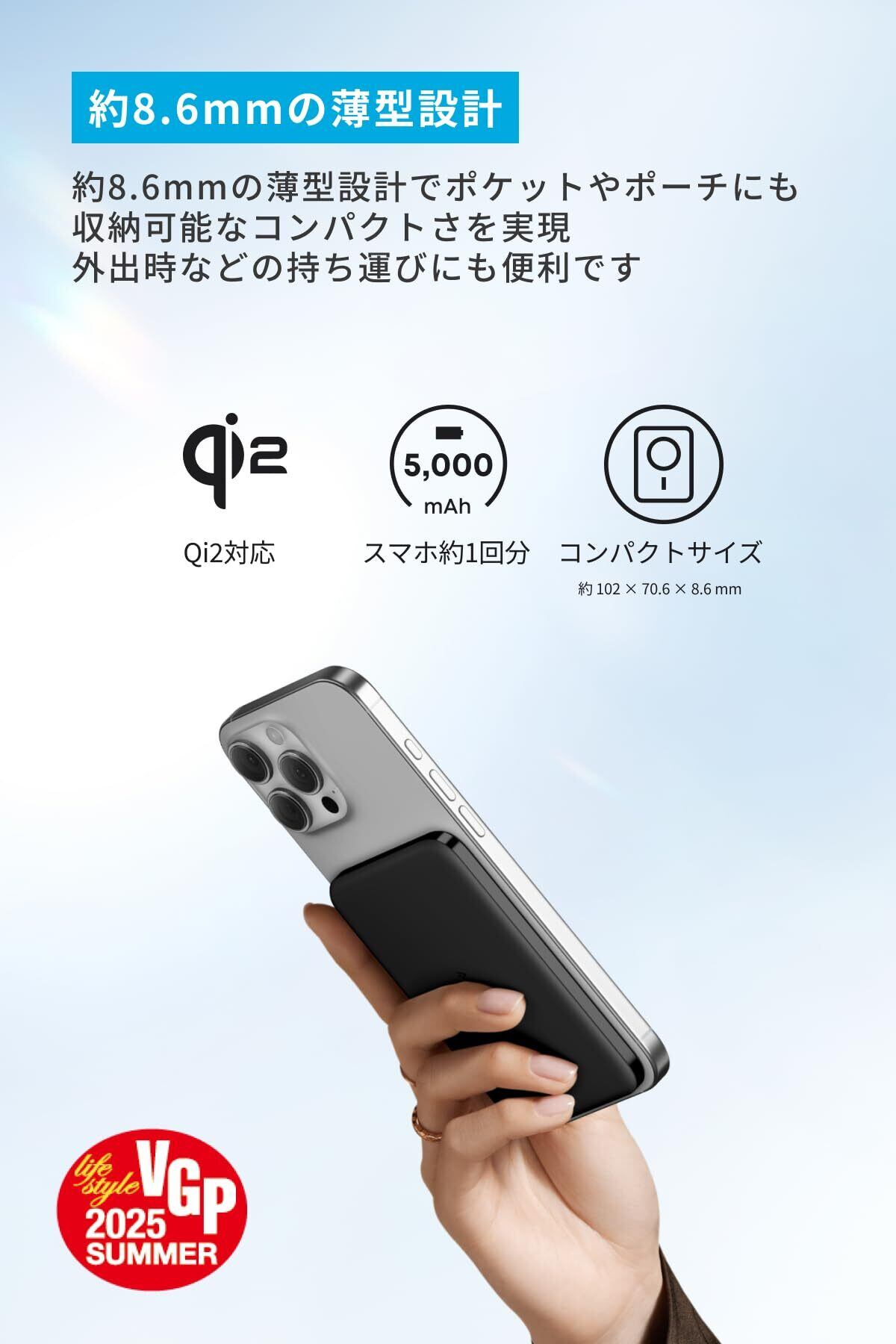 Qi2対応でスマホ約1回分充電可能:マグネット式ワイヤレス充電対応のモバイルバッテリーで、Qi2対応のスマホに最大15W出力かつ約1回分のワイヤレス充電が可能です。