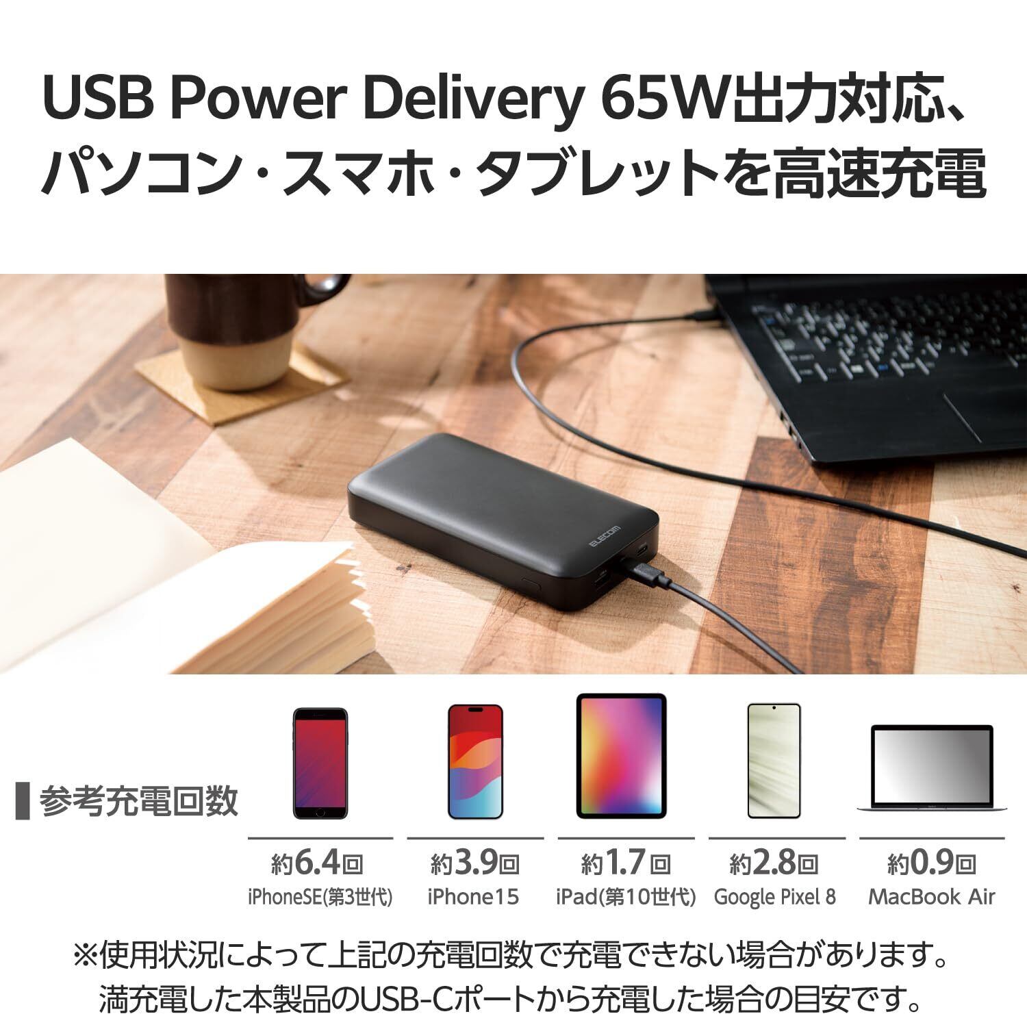 ■USB Power Delivery 65W出力に対応し、パソコン、スマートフォン、タブレットを高速充電できる、20000mAhモバイルバッテリーです。