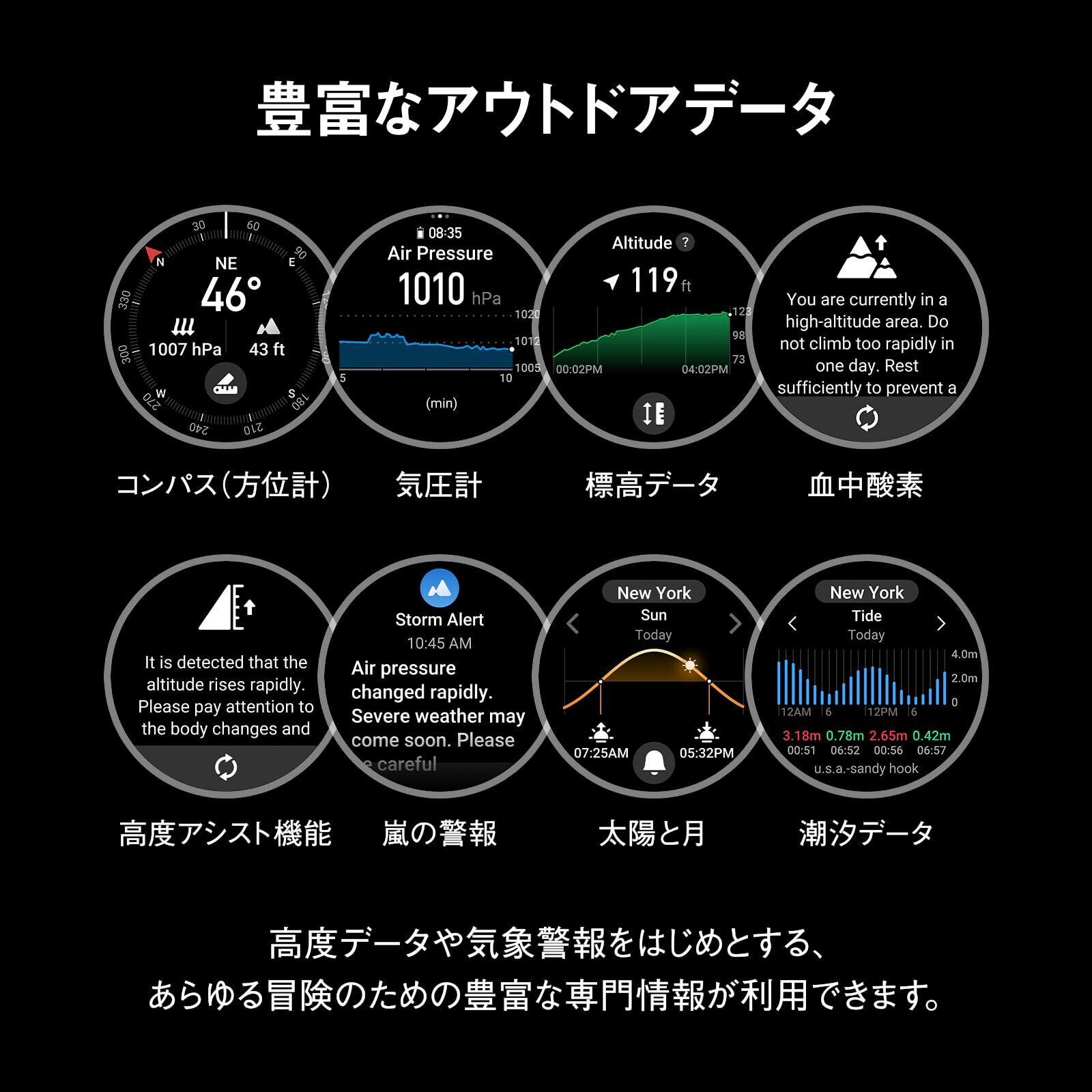 【ステンレススチールボディと卓越したディスプレイ性能】高強度なステンレススチールのベゼルと1.5インチの大画面で2,000nitを誇るディスプレイの融合は過酷な環境下でもあなたを支えます。また、暗い場所で目の疲れを軽減するナイトモードが搭載されてます。【軍用レベルの強靭さ】過酷な温度や環境に耐えるため、9項目の軍事規格の強靭性試験(MIL-STD-810G)をクリアしています。低温モードは、-30度の温度でも腕時計を使用可能で、あなたの限界への挑戦をサポートします。また、10ATMの防水性能を備え、最大45mのフリーダイビングに対応してます。