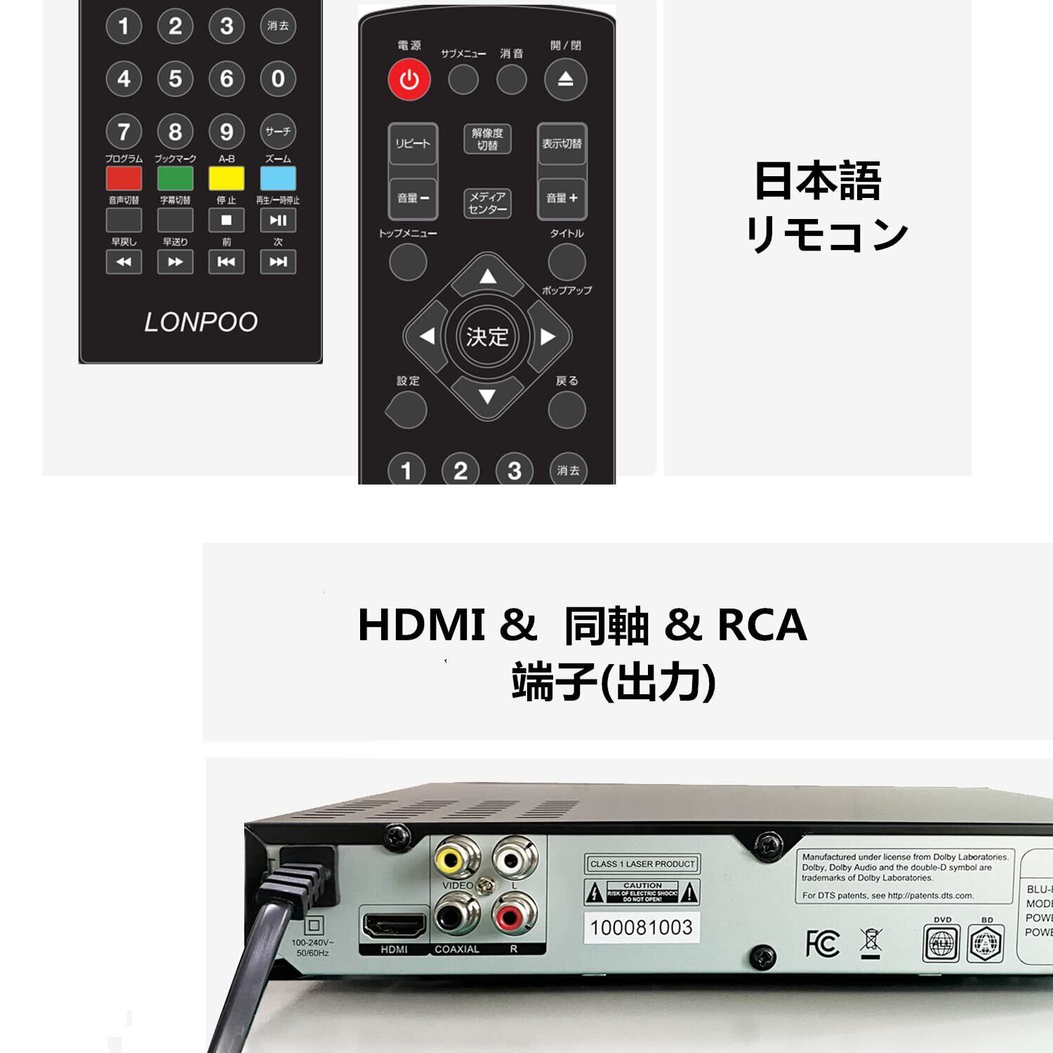 LONPOO DVD ブルーレイプレーヤー フルHD1080p DVDプレーヤー CPRM再生可能 HDMI/同軸/AV出力 高速起動 PAL/NTSC対応 USB/外付けHDD対応 Blu-rayリージョンA/1 AV/HDMIケーブル付き