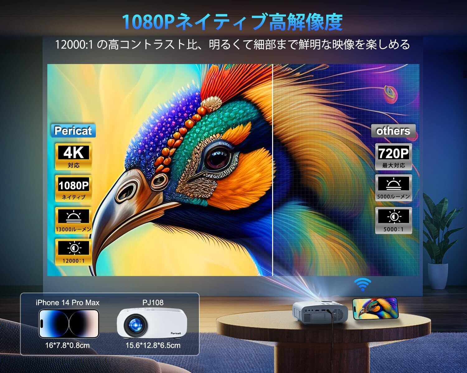 【2024技術革新版先行発売!超小型機能満載・高輝度15000LM・1080P高解像度・4K対応】2024年最新機能アプデの超小型プロジェクターが先行発売!PJ108小型プロジェクターはサイズと機能の規制を突破して、従来品と異なり15000LM、2.4G+5GWIFI、5.3Bluetooth、短距離投影、台形補正、ズームなどのアプデした機能が同時に搭載されている!明るさ50%アップ・画素数2.5倍アップ・色彩2倍アップ・通信速度アップ・通信距離アップ!PJ108プロジェクターは小型でも本格的な1080P高解像度にアップグレードし、また15000LMの高輝度と12000:1の高コントラスト比まであげて、圧縮なしで鮮明で高解像度な画像を実現し、よりします。機能満載であり、一台だけで十分!