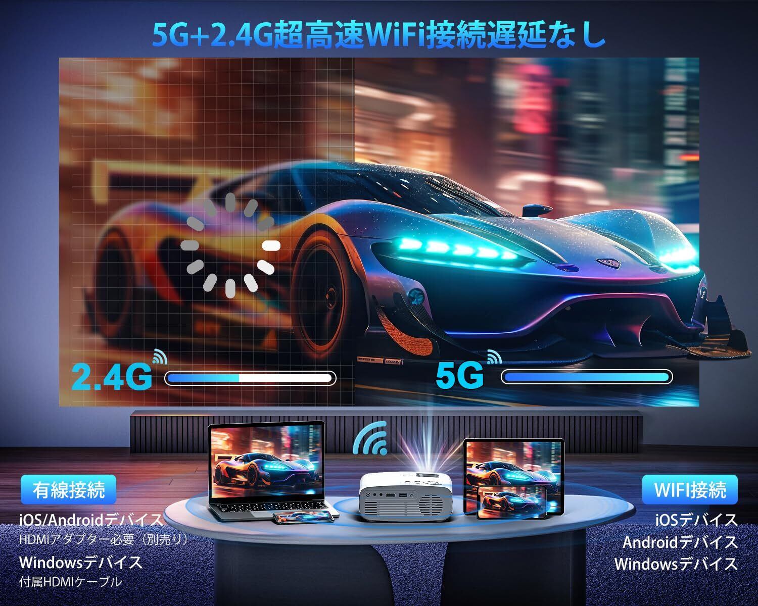 【ワイヤレス接続/高速5G&2.4GWIFI・Bluetooth5.3・高音質HI-FIスピーカー】業界初WIFI機能搭載した小型プロジェクターとして、PJ108は最新2.4Gまたは超高速5G WiFi接続を搭載し、ケーブル不要、wifi経由でIOS、AndroidおよびWindowsデバイスにすばやく接続でき、ワイヤレス投影模式に入ります。高強力な干渉防止機能により、遅延が 60% 削減されて、安定した信号と高速伝送速度を実現!Wi-Fi環境が無くても、スマホはプロジェクターのパスワードを経由で無線接続も可能、USBケーブル(HDMIアダプターが必要)での有線接続もできます。操作が簡単で、接続が速いです。高音質15WHIFIスピーカ―も内蔵され、外部スピーカーを用意する必要なく、立体的で臨場感に満ちた音場を忠実に再現し、お家で気楽に映画雰囲気を味わえる!Bluetooth5.3も搭載し、ワイヤレスでご愛用なBluetoothヘッドホンまたはスピーカーにも瞬時的に接続できます。さらに、 3.5mm Auxポート経由で外部スピーカーを接続でき、音質体験を上げることができます。