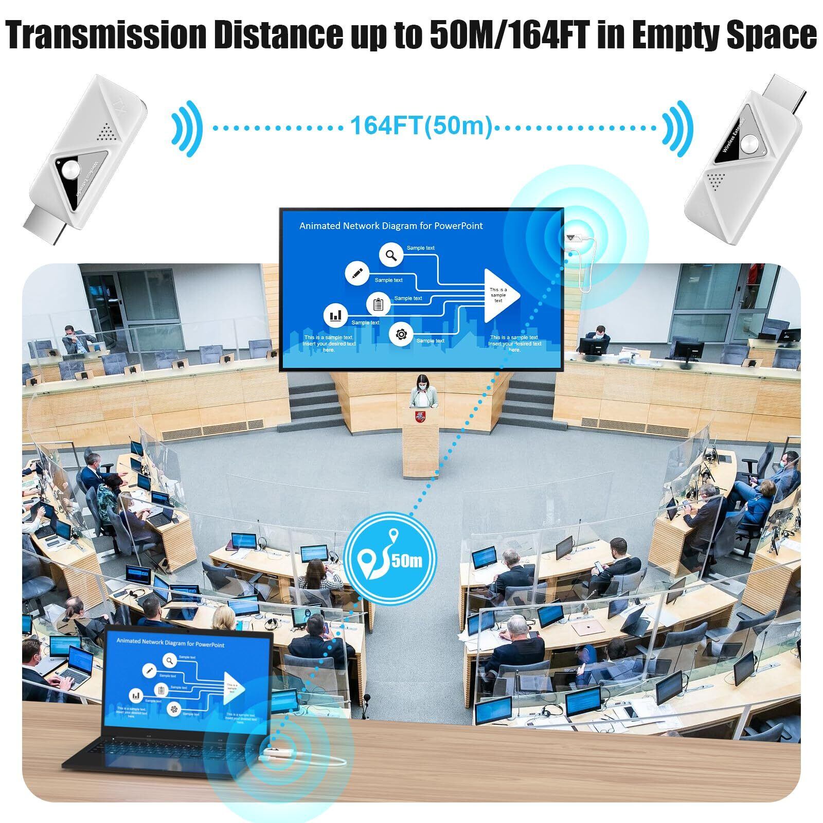 【50m距離無線安定伝送】: 高速5Ghz波数帯の利用で、安定伝送をサポートします。HDMI信号を無線で、壁越しでも、最大50mまでの超遠距離を伝送可能です。従来のケーブルタイプのようにテレビの傍に置く必要はありません。テレビから離れて端末を操作しながらワイヤレスで画面投影できます。じた長いケーブルを用意する必要がなく、手軽に使用できます。