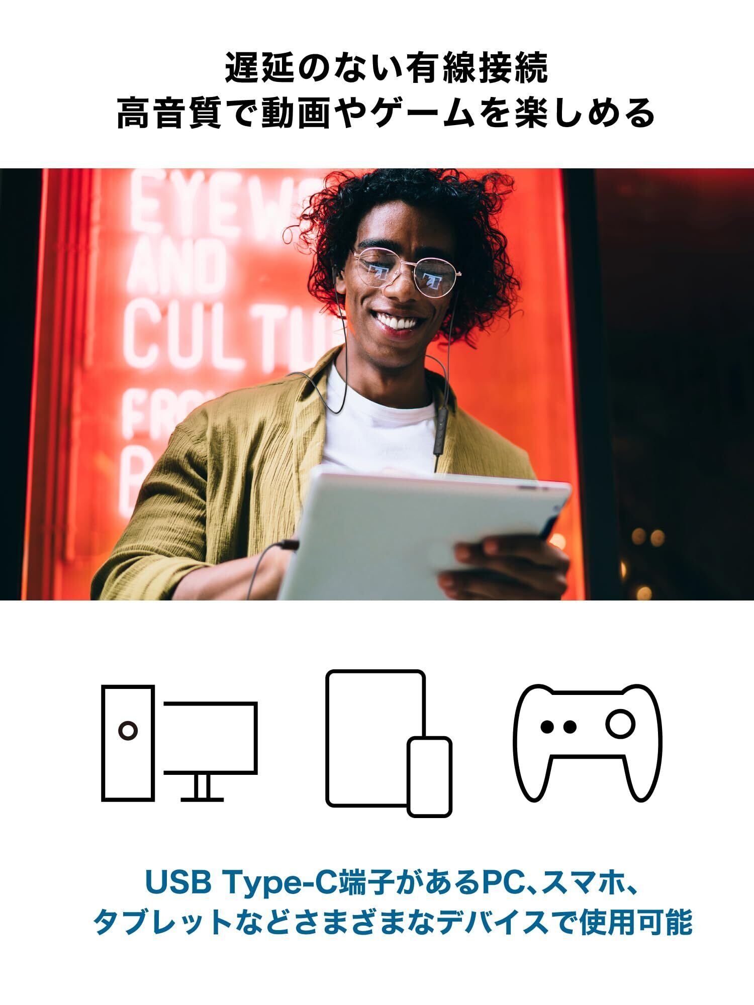 ストレスのない動画視聴やゲームプレイ:端子にそのまま接続できるため、音の途切れや遅れは一切ありません。そのため、動画視聴はもちろん、音が聴こえるタイミングが重要なゲームプレイに最適です。デジタル出力にも対応しているため、幅広いスマートフォンの機種でお使いいただけます。