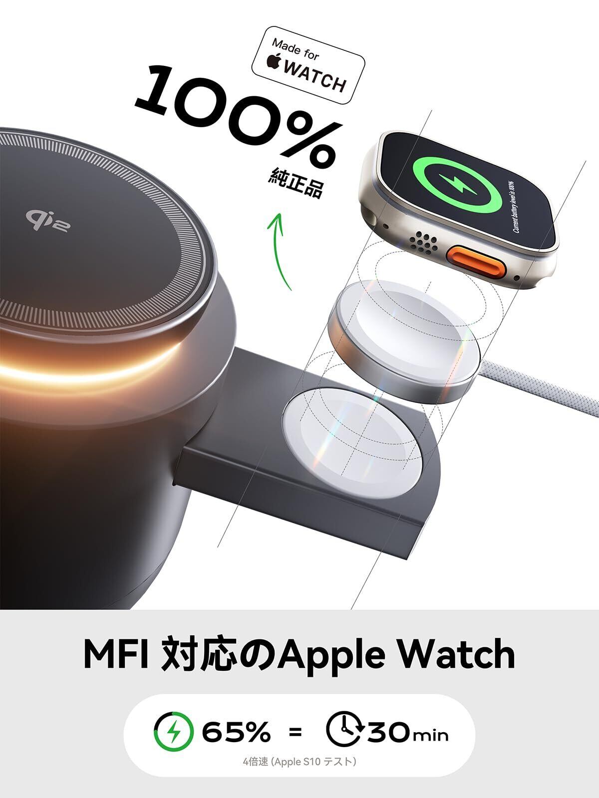 【MFi認証済み & Apple Watch対応】Apple公式認証取得済み iPhone 16/15/14/13/12/11/X/8、iPad、iPod、Apple Watchと完全互換性を保証。Apple正規認証であるMade for Apple Watchも取得. iOSアップデート後も警告表示なしで安定動作!Apple認証チップと高品質素材採用で過熱/短絡/機器損傷を防止。非認証充電器比最大3倍の高速充電を実現。非認証品と異なり100%バッテリー健康保護を維持し、システムアップデート起因の充電トラブルを回避。本物のMFi認証製品をお選びください!
