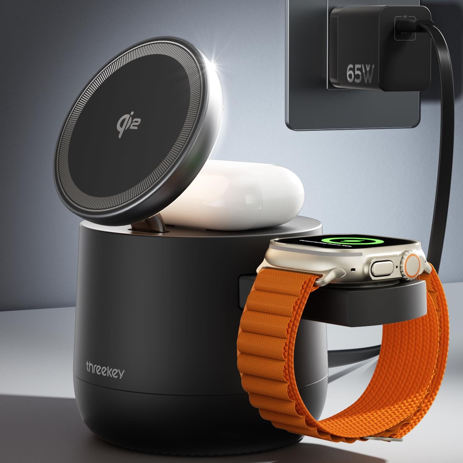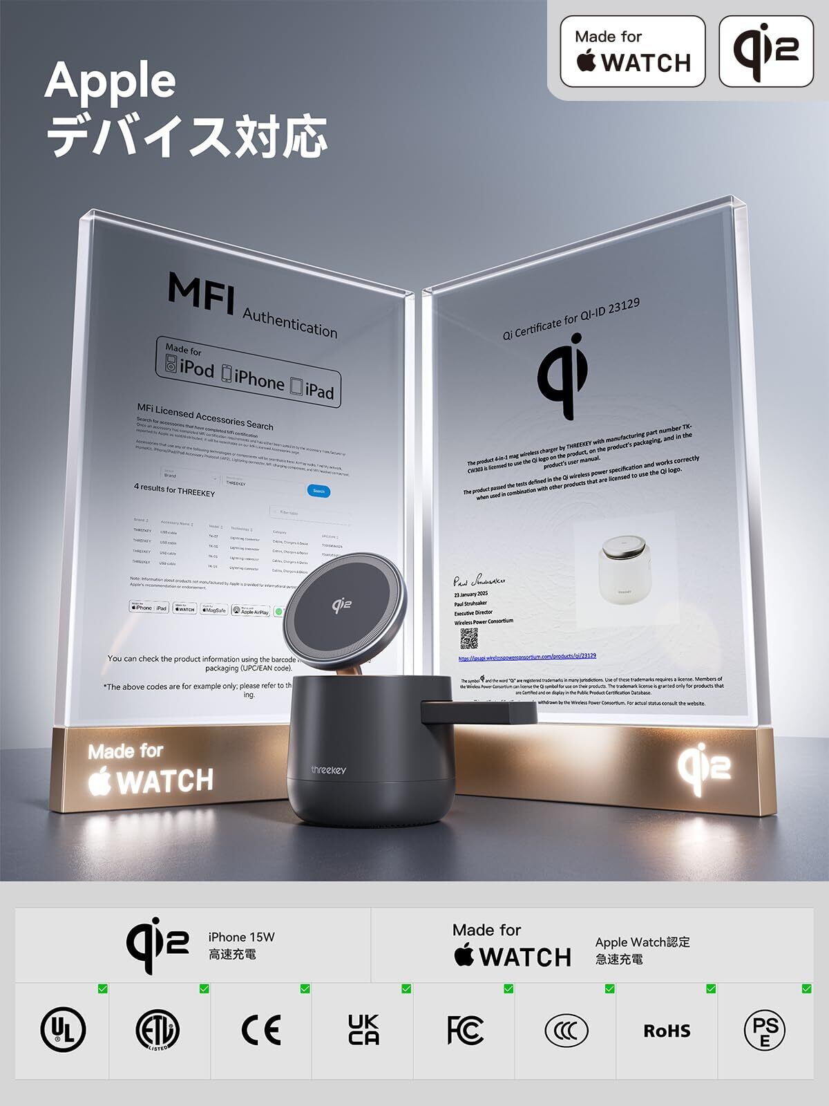 【新着商品】4in 1【MFI Qi2 PSE 公式認証】MagSafe 15W ワイヤレス充電器、[Apple公認] Threekey Apple Watch対応 MagSafe充電器ステーション ドックキューブ 環境光付き iPhone 16/15/14/13 12&Apple Watch&Airpods&iPad対応 置くだけ充電,65W AC電源アダプタと1.5mの編み込みデータケーブルが付属します | ニコニコSHOP