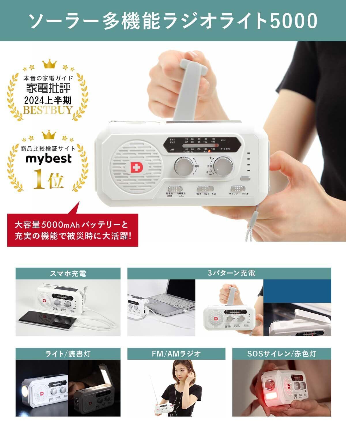家電批評ベストバイ受賞 ソーラー多機能 防災ラジオ ライト 5000mAhバッテリー搭載 スマホ充電 手回し 充電3パターン 防災グッズ 防災防犯ダイレクト