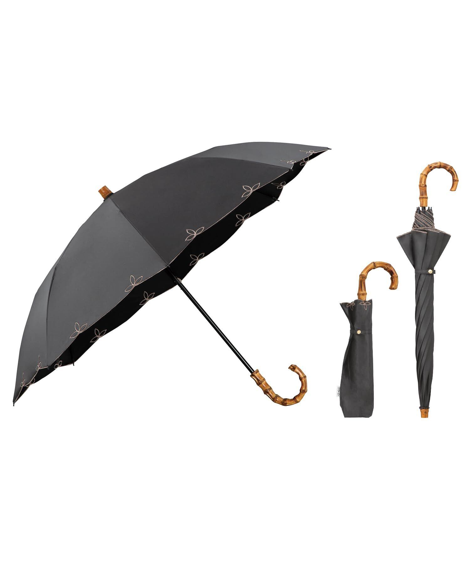 Wpc. 最強の日傘 UVO(ウーボ)折りたたみ傘/2段 刺繍スカラップ ブラック《遮光率&UVカット率100%/UPF50+/遮熱/晴雨兼用》50cm レディース 長傘としても使える 2way バンブー おしゃれ UVO2F-009