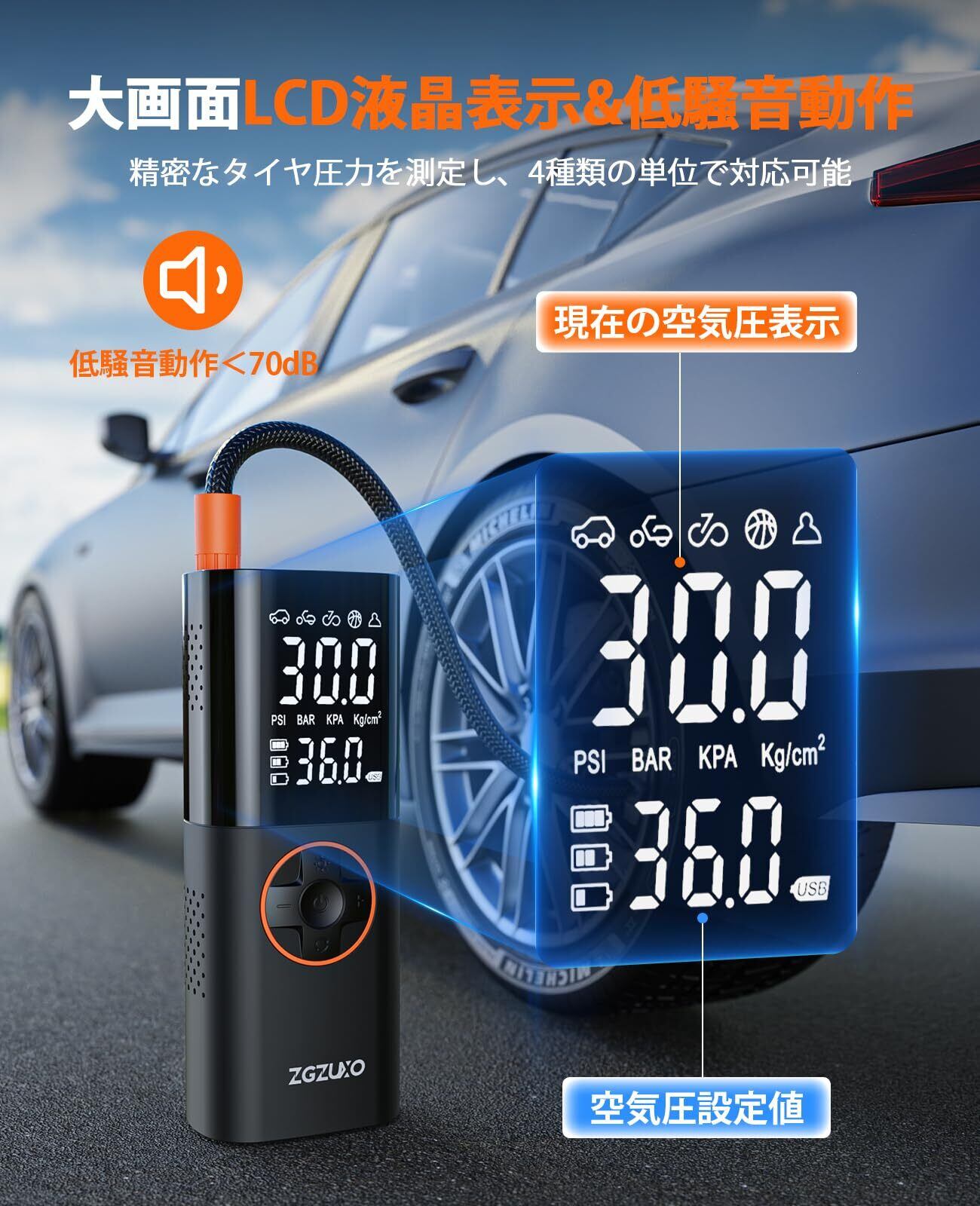 【7800mAh 大容量電池・タイヤ空気圧検知】Zgzuxo空気入れ 電動は大容量の 7800mAh リチウムイオン バッテリーを搭載したこのポンプは、1 回の充電で4 台の車のタイヤを膨らませることができます。市場で最大のバッテリー量を採用し、使用時間が2倍に増加した。一度充電して長時間動作可能です。アウトドアやレジャーはもちるん、日常生活に欠かせない。コードレスでタイヤのエアコンプレッサーを手軽に実現、両手を解放されます。これにより、外出中に電源が切れる心配がなくなります。ZGZUXO電動空気入れは精密なタイヤ圧力を測定し、タイヤ圧力の状態を簡単に読み取り、観察することができます。正確な空気圧管理を簡単に行えます。